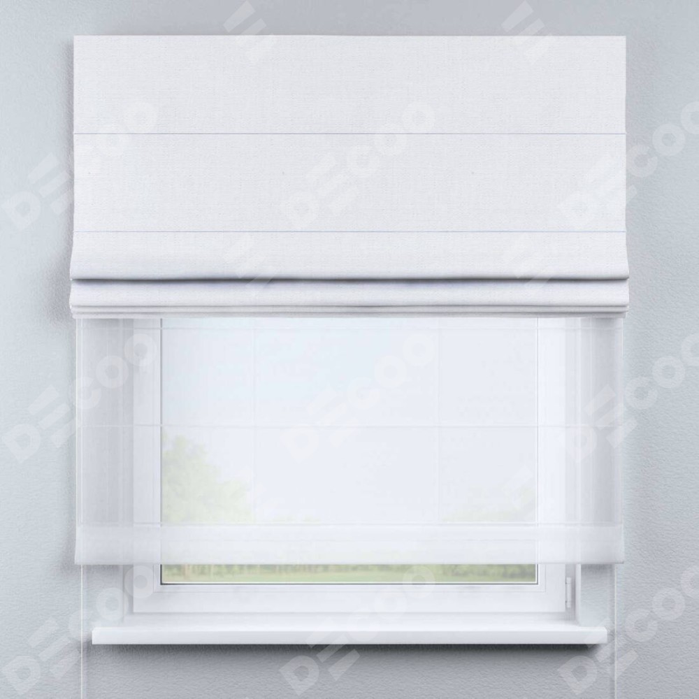 Римская штора день-ночь (двойная) от производителя «Cortin», используется для проёма. Пошита из двух полотен, основная ткань лён белый артикул 53430, вторая ткань тюль (по стандарту используется тюль белого цвета артикул V-01). Имеет универсальный механизм и подходит для монтажа: на потолок, на стену и в нишу.