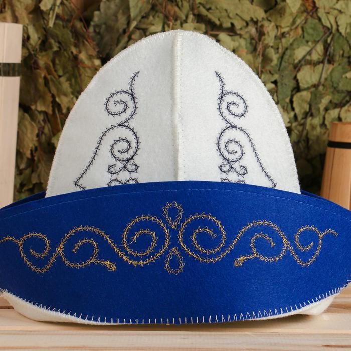 Шапка для бани с вышивкой «Казахстанский колпак мужской» с золотыми и голубыми узорами