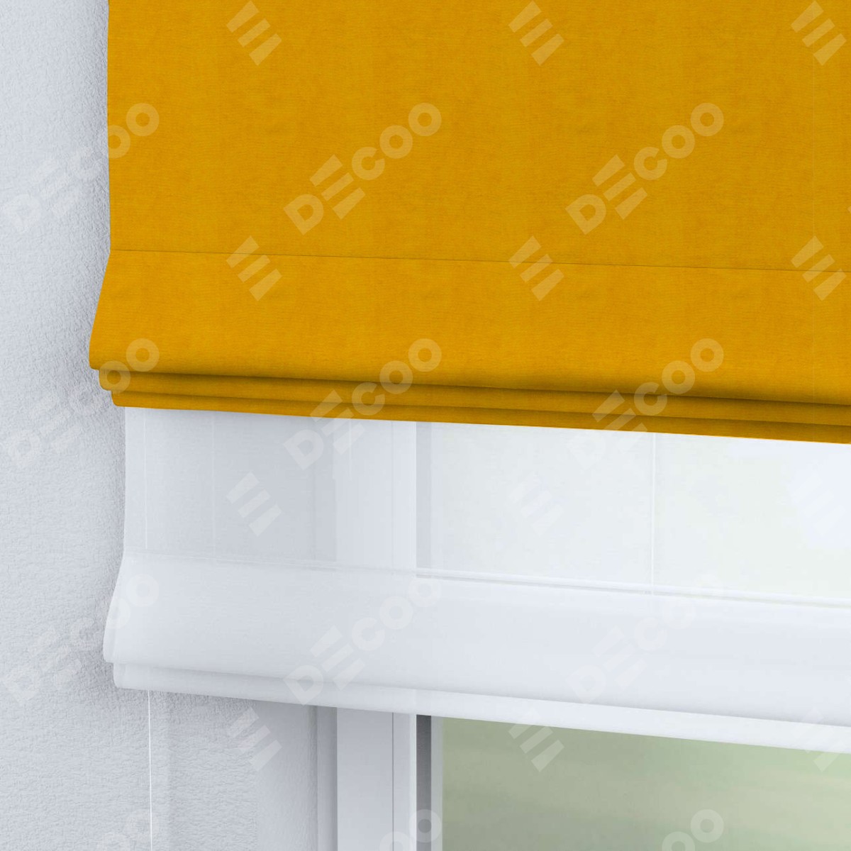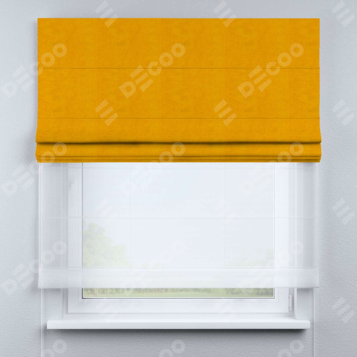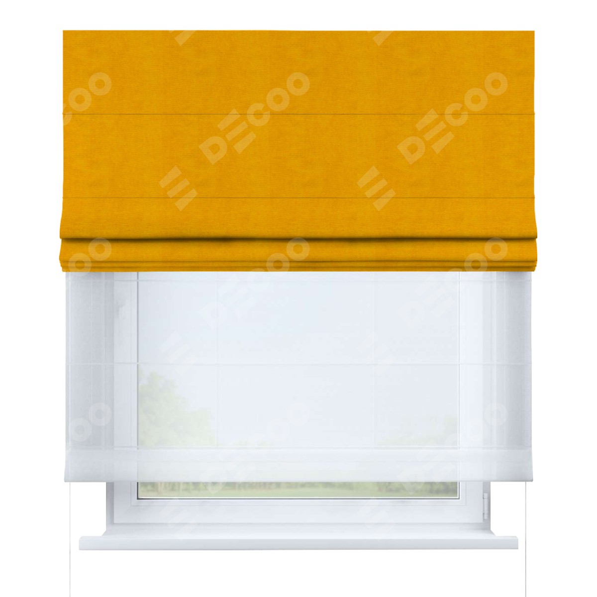 Римская штора день-ночь производителя «Cortin», используется для проёма, пошита из двух полотен, с лицевой стороны вельвет желтый артикул 85547, вторая ткань тюль (по стандарту комплектуется тюль белого цвета артикул V-01). Имеет универсальный механизм и подходит для монтажа: на потолок, на стену и в нишу.