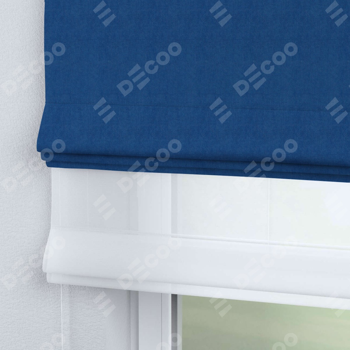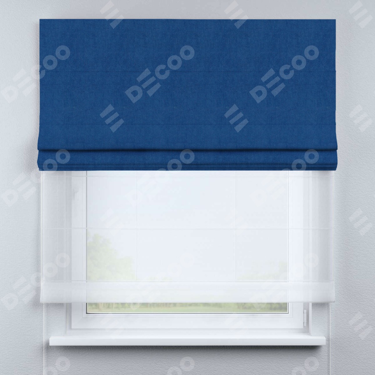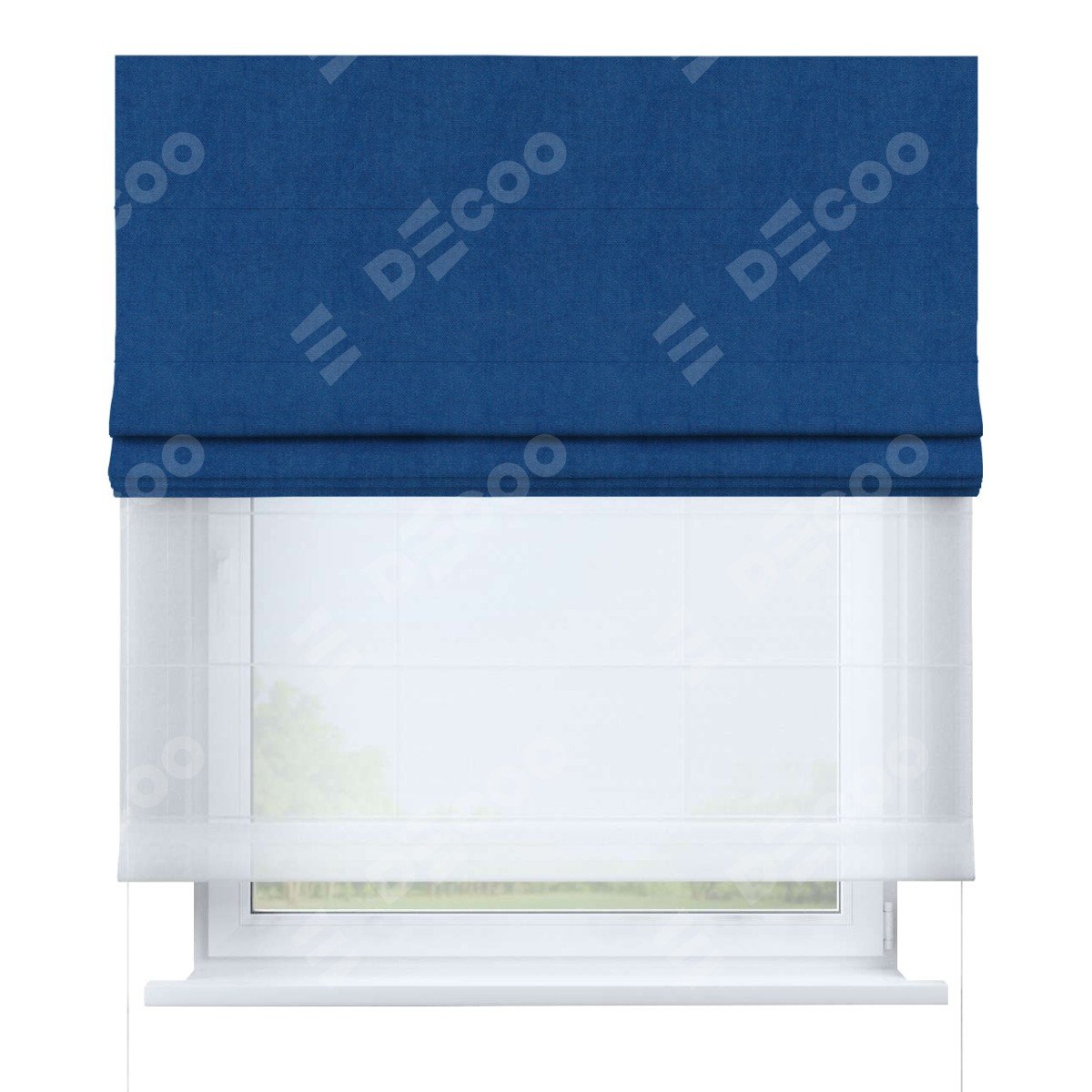 Римская штора день-ночь производителя «Cortin», используется для проёма, пошита из двух полотен, с лицевой стороны вельвет синий артикул 85554, вторая ткань тюль (по стандарту комплектуется тюль белого цвета артикул V-01). Имеет универсальный механизм и подходит для монтажа: на потолок, на стену и в нишу.