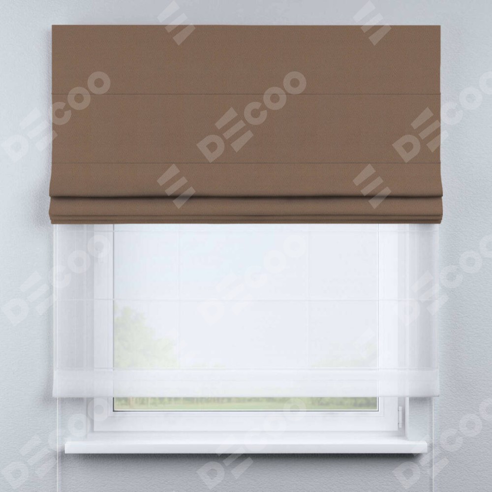 Римская штора день-ночь производителя «Cortin», используется для проёма, пошита из двух полотен, с лицевой стороны блэкаут однотонный коричневый артикул 88285, вторая ткань тюль (по стандарту комплектуется тюль белого цвета артикул V-01). Имеет универсальный механизм и подходит для монтажа: на потолок, на стену и в нишу.