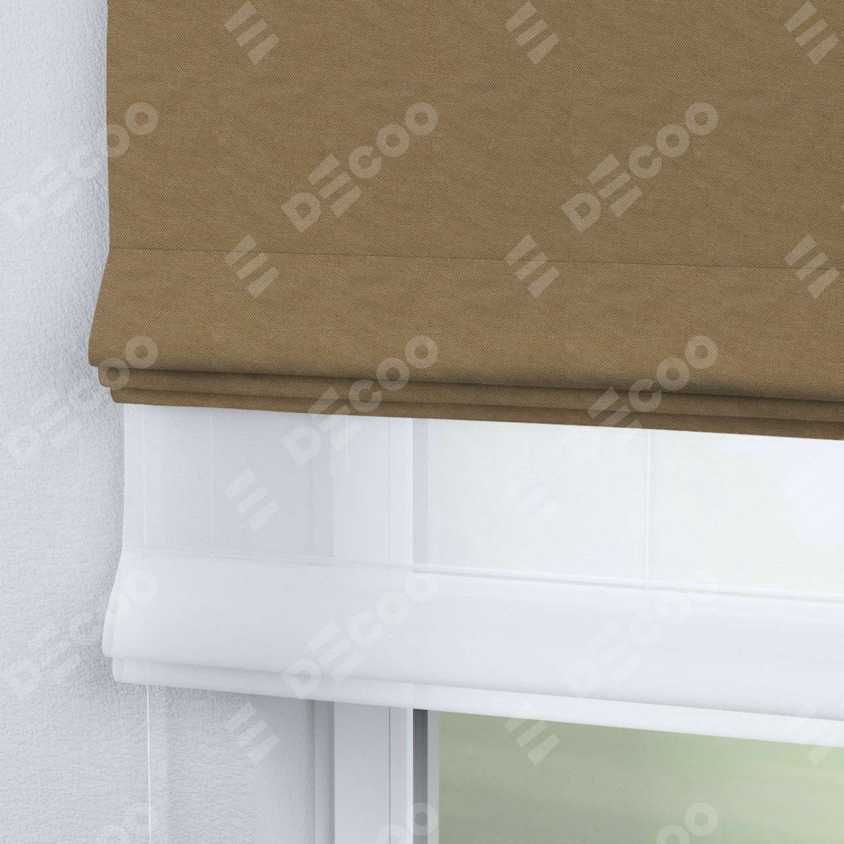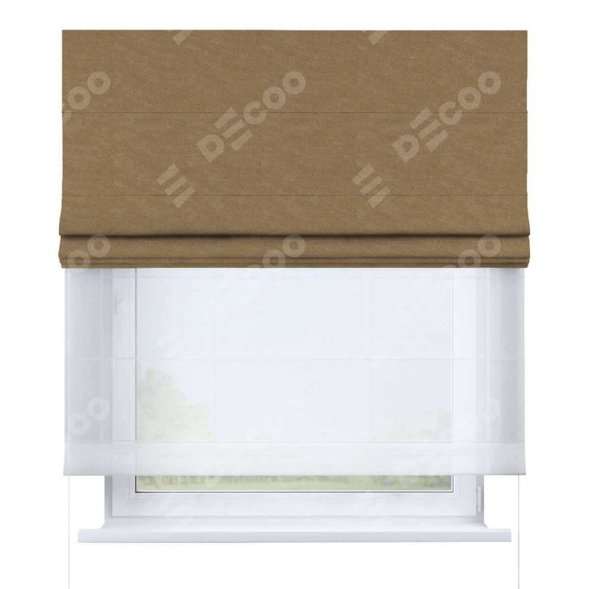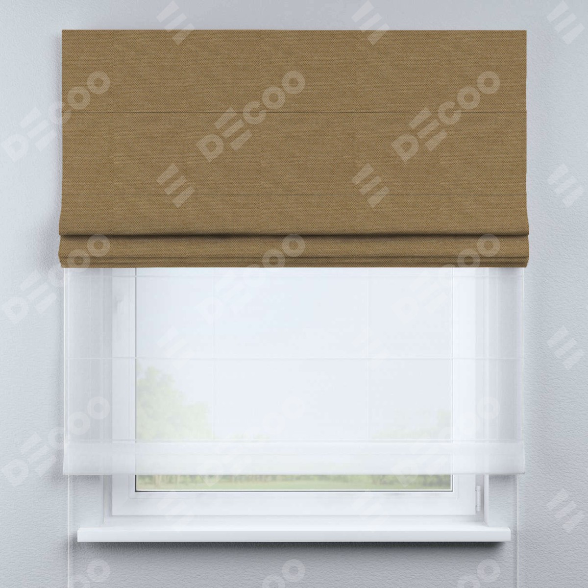 Римская штора день-ночь производителя «Cortin», используется для проёма, пошита из двух полотен, с лицевой стороны лён димаут коричневый артикул 83026, вторая ткань тюль (по стандарту комплектуется тюль белого цвета артикул V-01). Имеет универсальный механизм и подходит для монтажа: на потолок, на стену и в нишу.