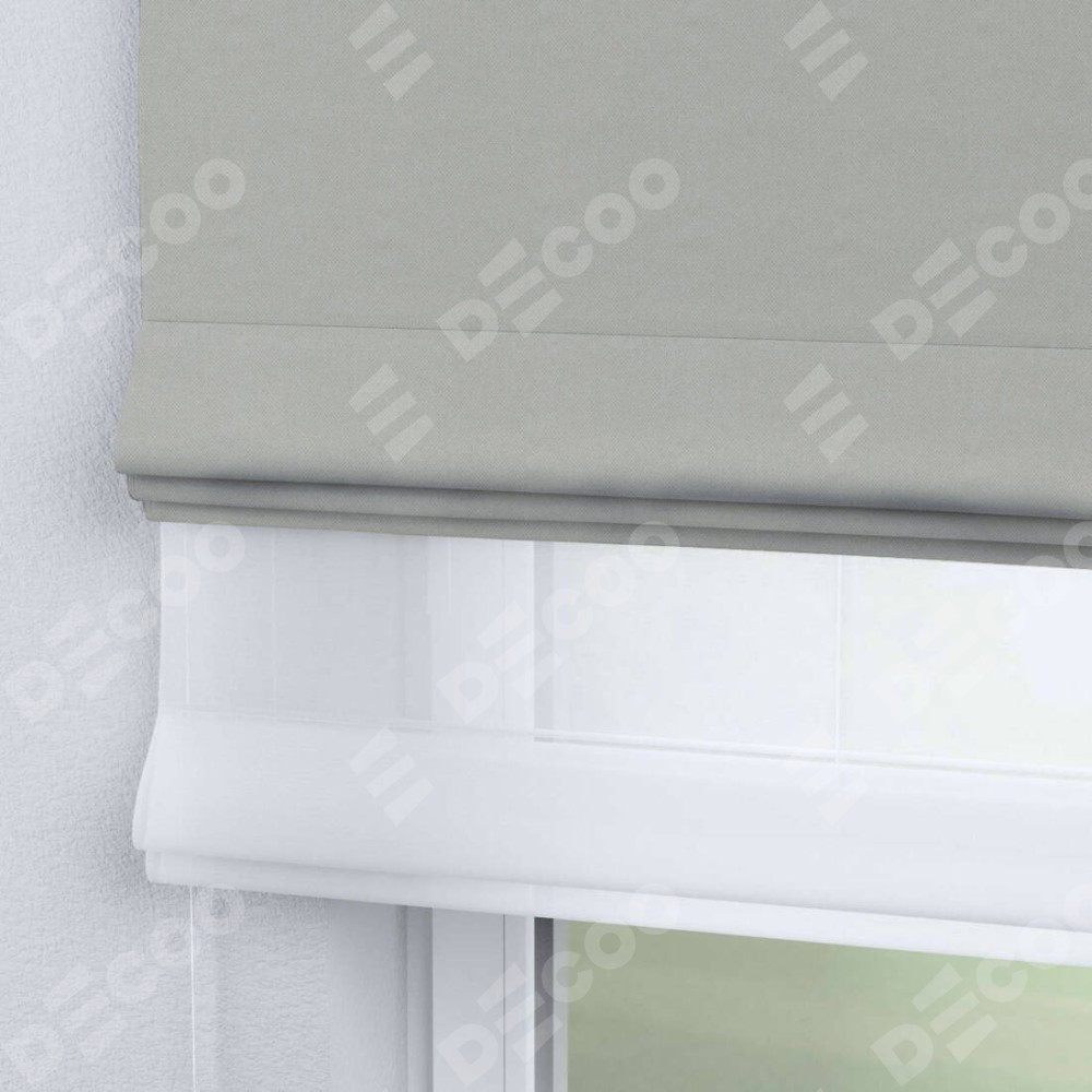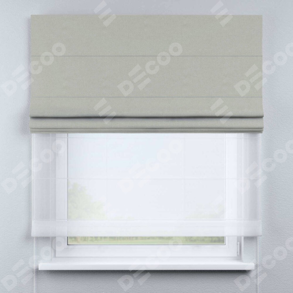 Римская штора день-ночь производителя «Cortin», используется для проёма, пошита из двух полотен, с лицевой стороны лён димаут светло-серый артикул 83025, вторая ткань тюль (по стандарту комплектуется тюль белого цвета артикул V-01). Имеет универсальный механизм и подходит для монтажа: на потолок, на стену и в нишу.