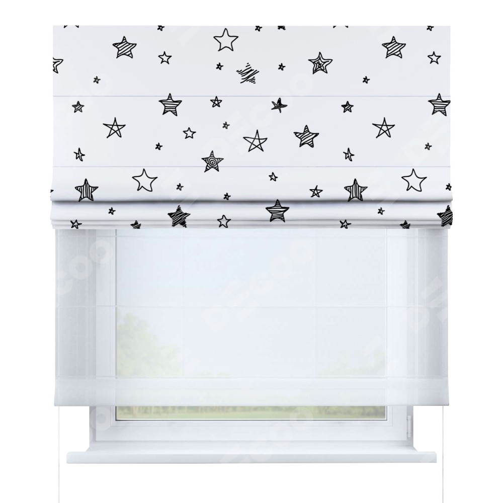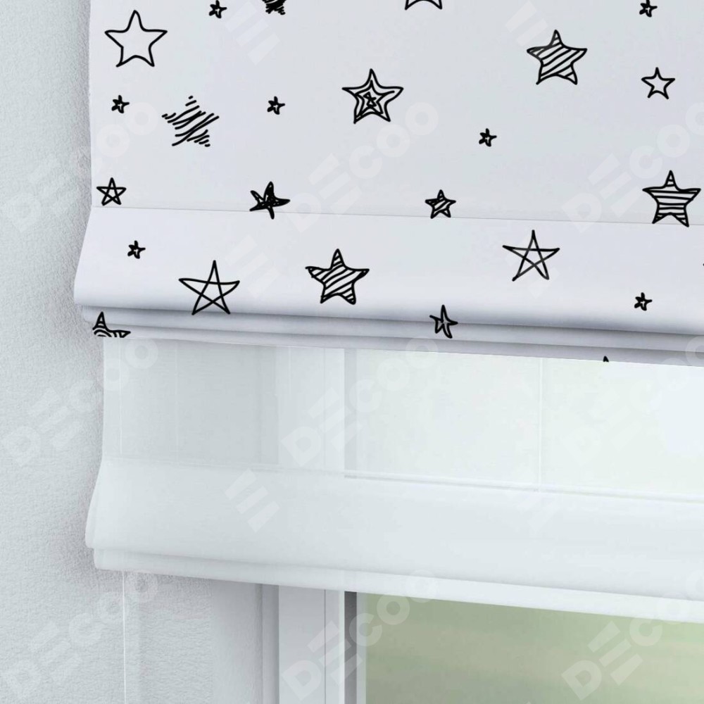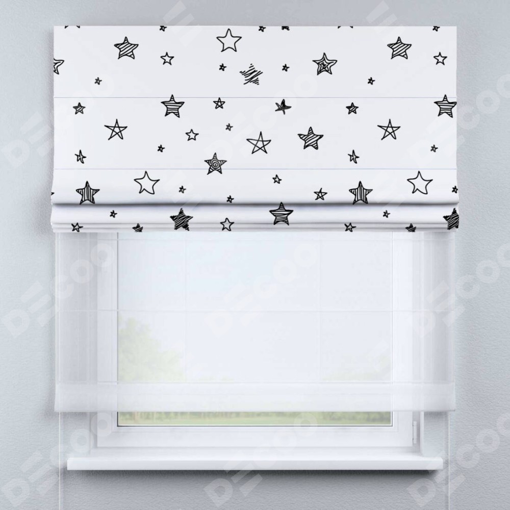 Римская штора день-ночь производителя «Cortin», используется для проёма, пошита из двух полотен, с лицевой блэкаут с нанесением сублимационной печати «Звёзды», вторая ткань тюль (по стандарту комплектуется тюль белого цвета артикул V-01). Имеет универсальный механизм и подходит для монтажа: на потолок, на стену и в нишу.