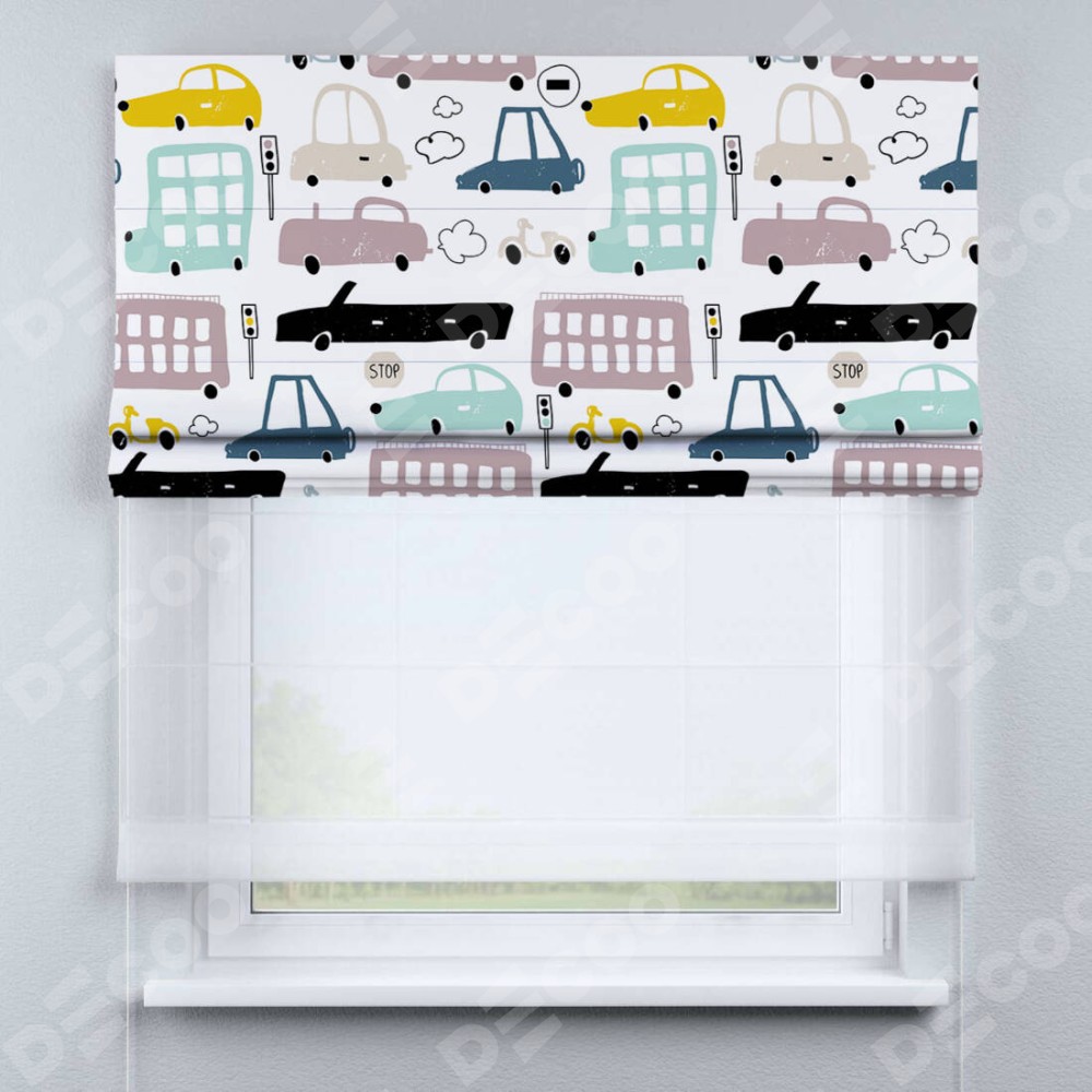 Римская штора день-ночь производителя «Cortin», используется для проёма, пошита из двух полотен, с лицевой блэкаут с нанесением сублимационной печати «Красочный трафик», вторая ткань тюль (по стандарту комплектуется тюль белого цвета артикул V-01). Имеет универсальный механизм и подходит для монтажа: на потолок, на стену и в нишу.