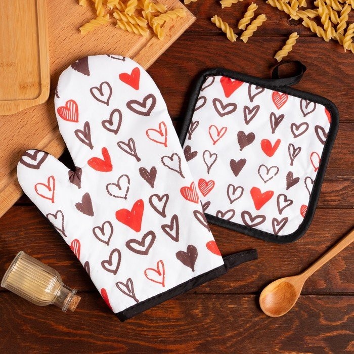 Кухонный набор (2 предмета) Этель LoveLife «Сердечки», прихватка 17×17 см, рукавичка 26×16 см, 100% п/э