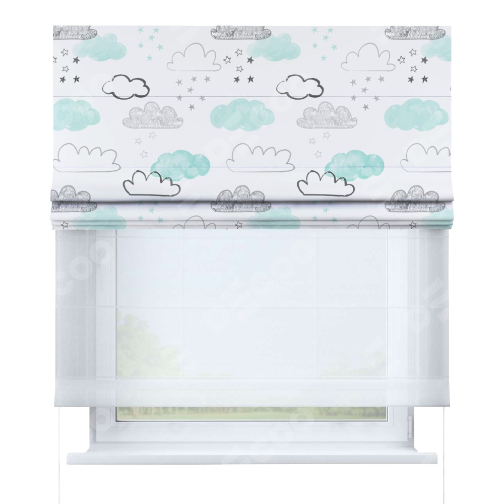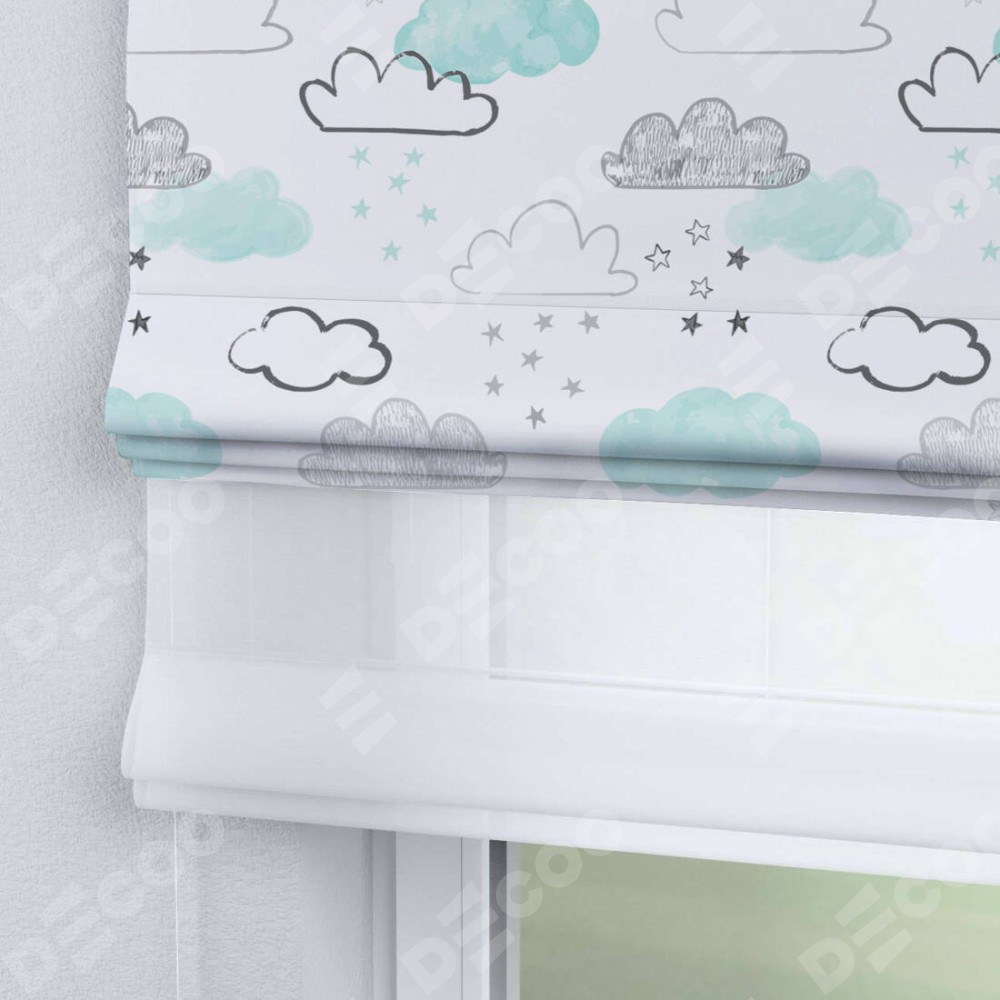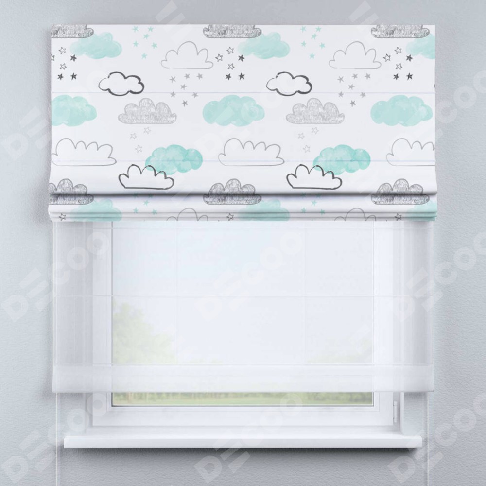 Римская штора день-ночь производителя «Cortin», используется для проёма, пошита из двух полотен, с лицевой блэкаут с нанесением сублимационной печати «Облака и звёзды», вторая ткань тюль (по стандарту комплектуется тюль белого цвета артикул V-01). Имеет универсальный механизм и подходит для монтажа: на потолок, на стену и в нишу.