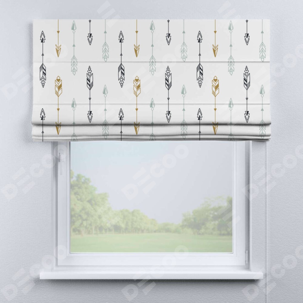 Римская штора производителя «Cortin», используется для проёма, пошита из ткани блэкаут с нанесением сублимационной печати «Любимые стрелки». Имеет универсальный механизм и подходит для монтажа: на потолок, на стену и в нишу.