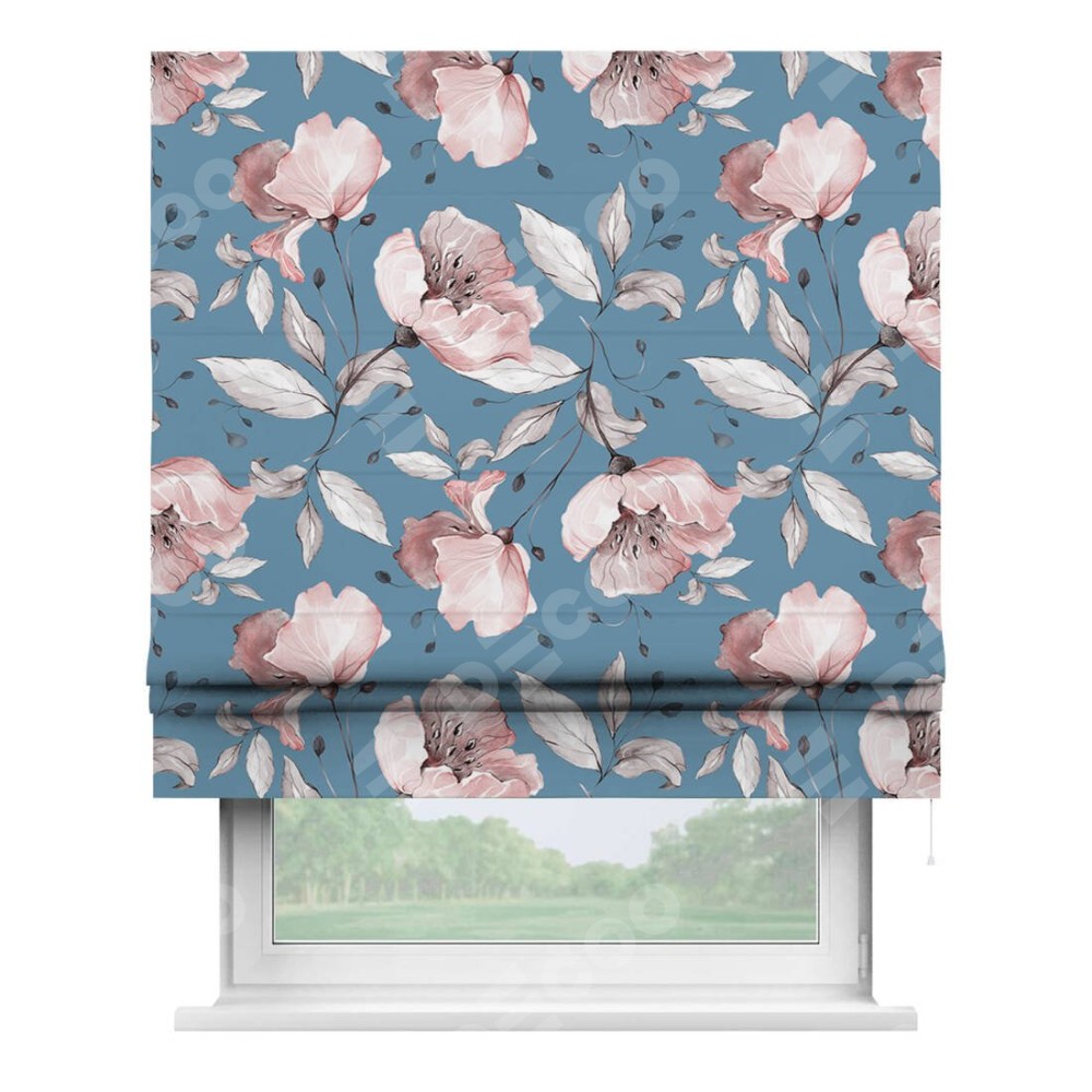 Римская штора производителя «Cortin», используется для проёма, пошита из ткани блэкаут с нанесением сублимационной печати «Розовая лагуна». Имеет универсальный механизм и подходит для монтажа: на потолок, на стену и в нишу.