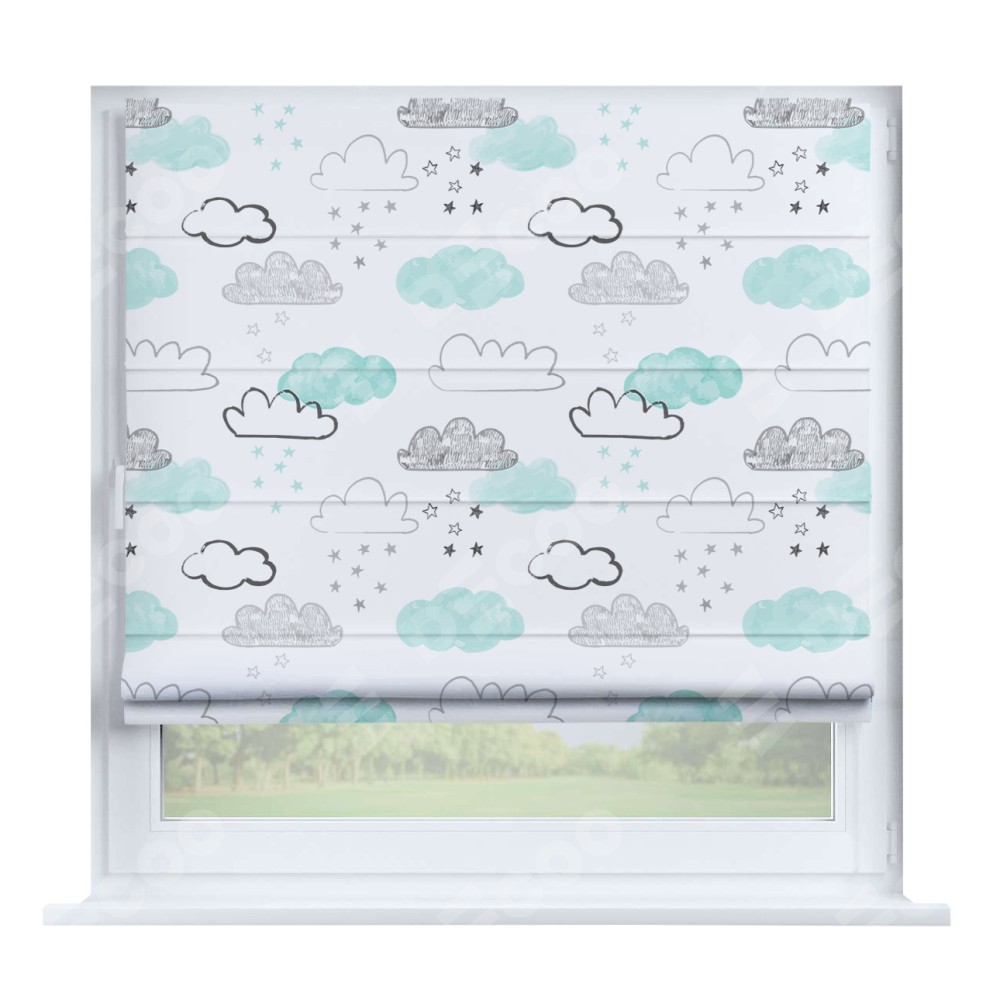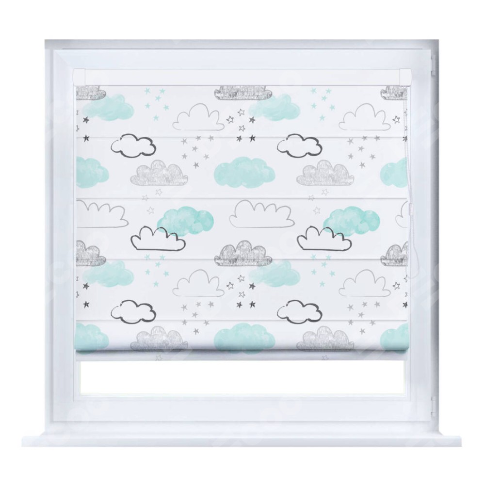 Римская штора производителя «Cortin», устанавливается на створку окна, пошита из ткани блэкаут с нанесением сублимационной печати «Облака и звёзды». Штора шьётся по индивидуальным размерам, для данного типа римской шторы возможная ширина от 35 до 150 см., высота до 250 см.