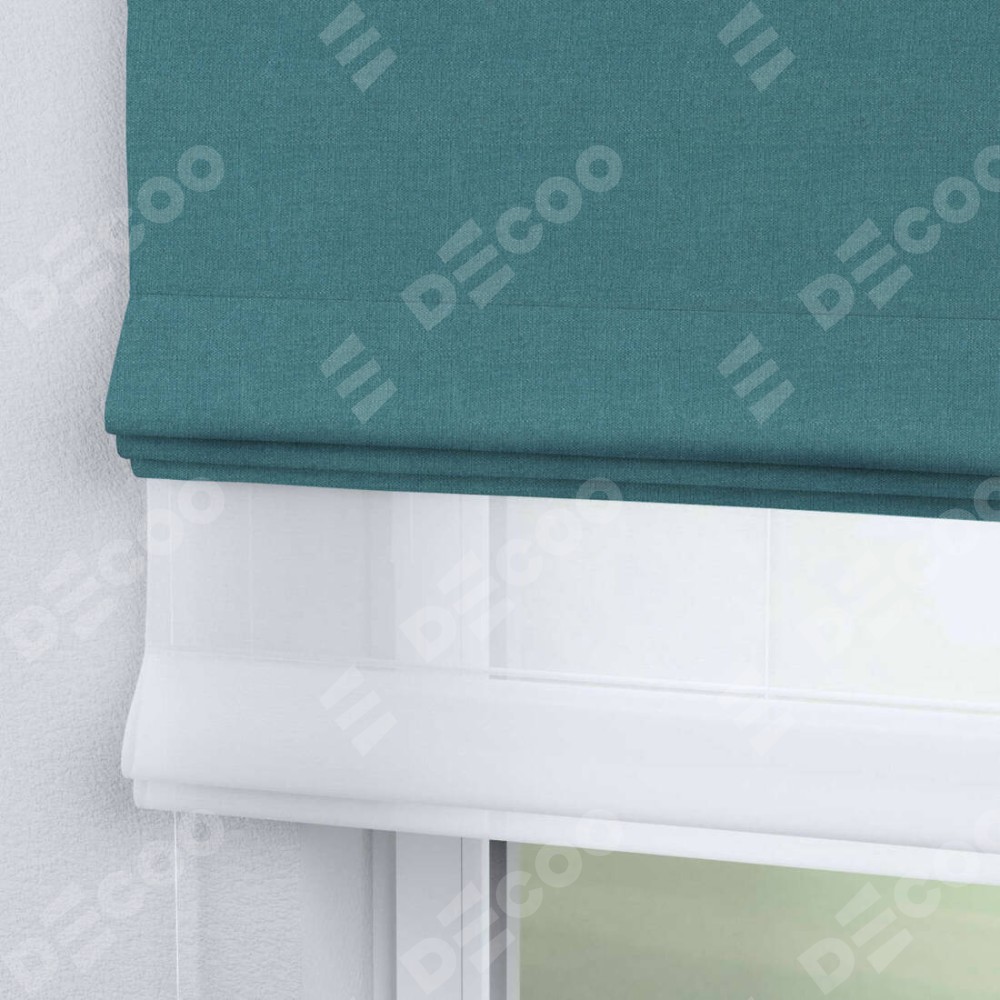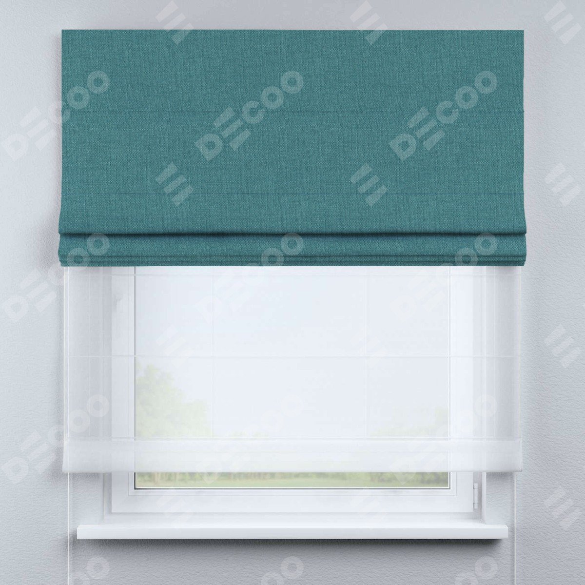Римская штора день-ночь производителя «Cortin», используется для проёма, пошита из двух полотен, с лицевой стороны лён бирюзовый артикул 53436, вторая ткань тюль (по стандарту комплектуется тюль белого цвета артикул V-01). Имеет универсальный механизм и подходит для монтажа: на потолок, на стену и в нишу.