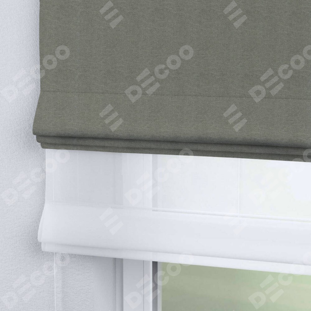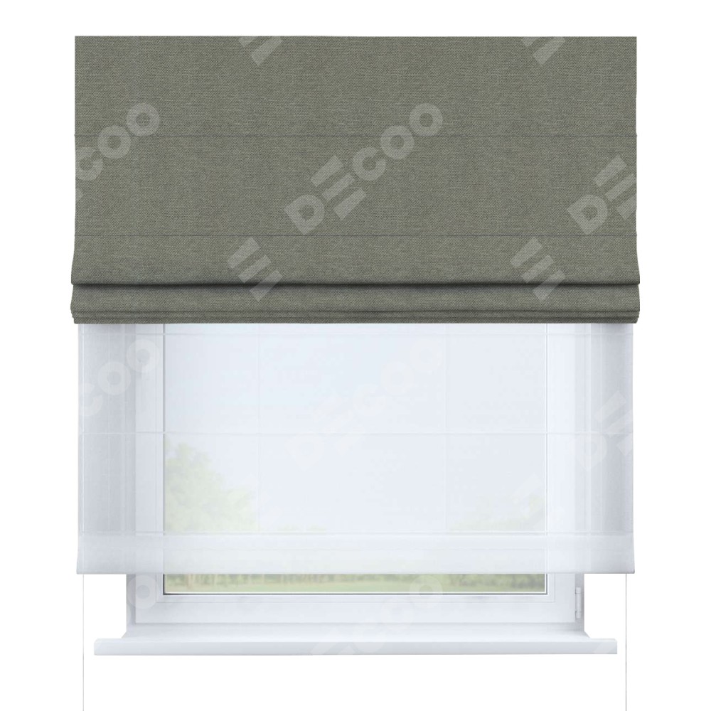 Римская штора день-ночь производителя «Cortin», используется для проёма, пошита из двух полотен, с лицевой стороны лён димаут стальной артикул 25, вторая ткань тюль (по стандарту комплектуется тюль белого цвета артикул V-01). Имеет универсальный механизм и подходит для монтажа: на потолок, на стену и в нишу.