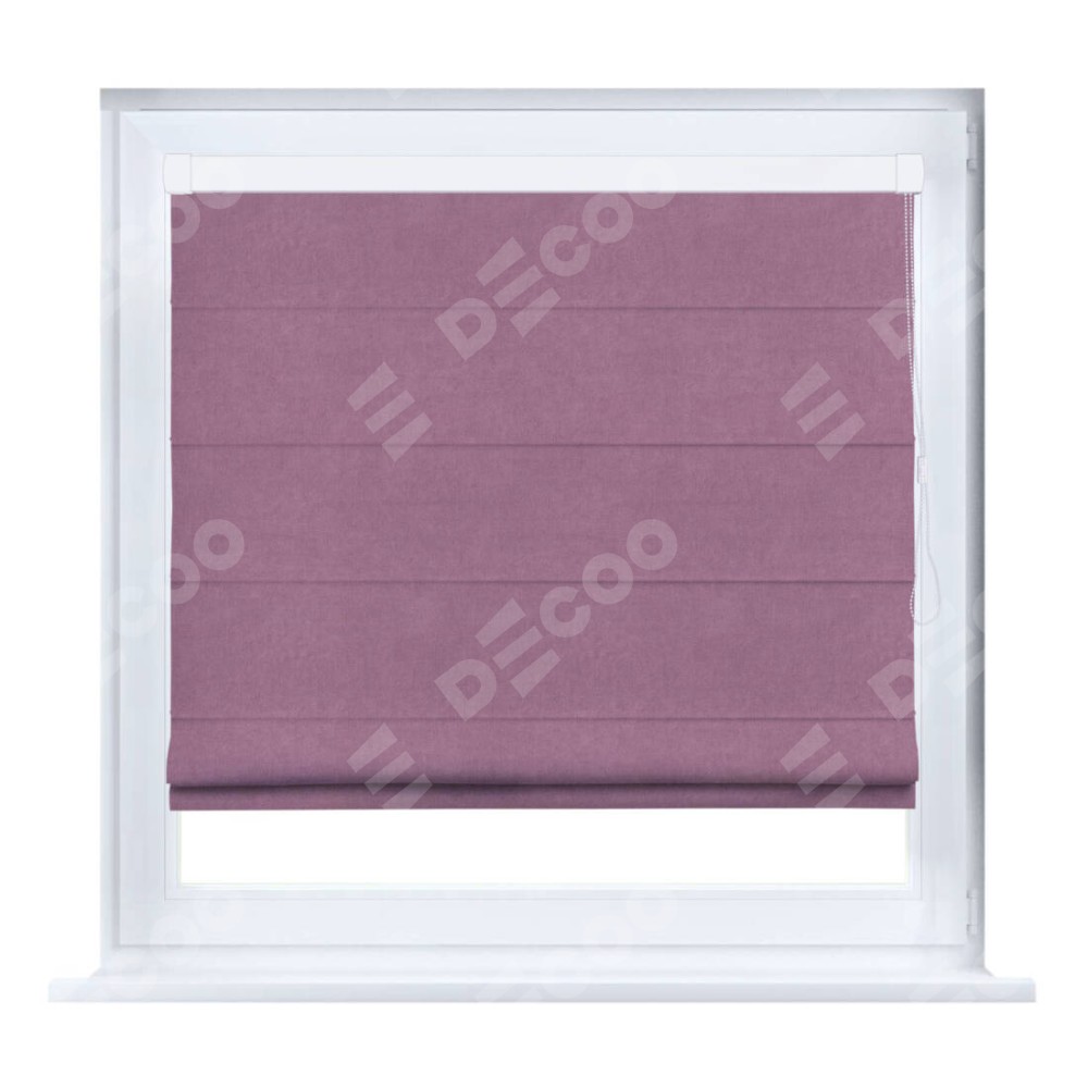 Римская штора производителя «Cortin», устанавливается на створку окна, пошита из ткани вельвет лиловый, артикул 17752. Штора шьётся по индивидуальным размерам, для данного типа римской шторы возможная ширина от 35 до 150 см., высота до 250 см.