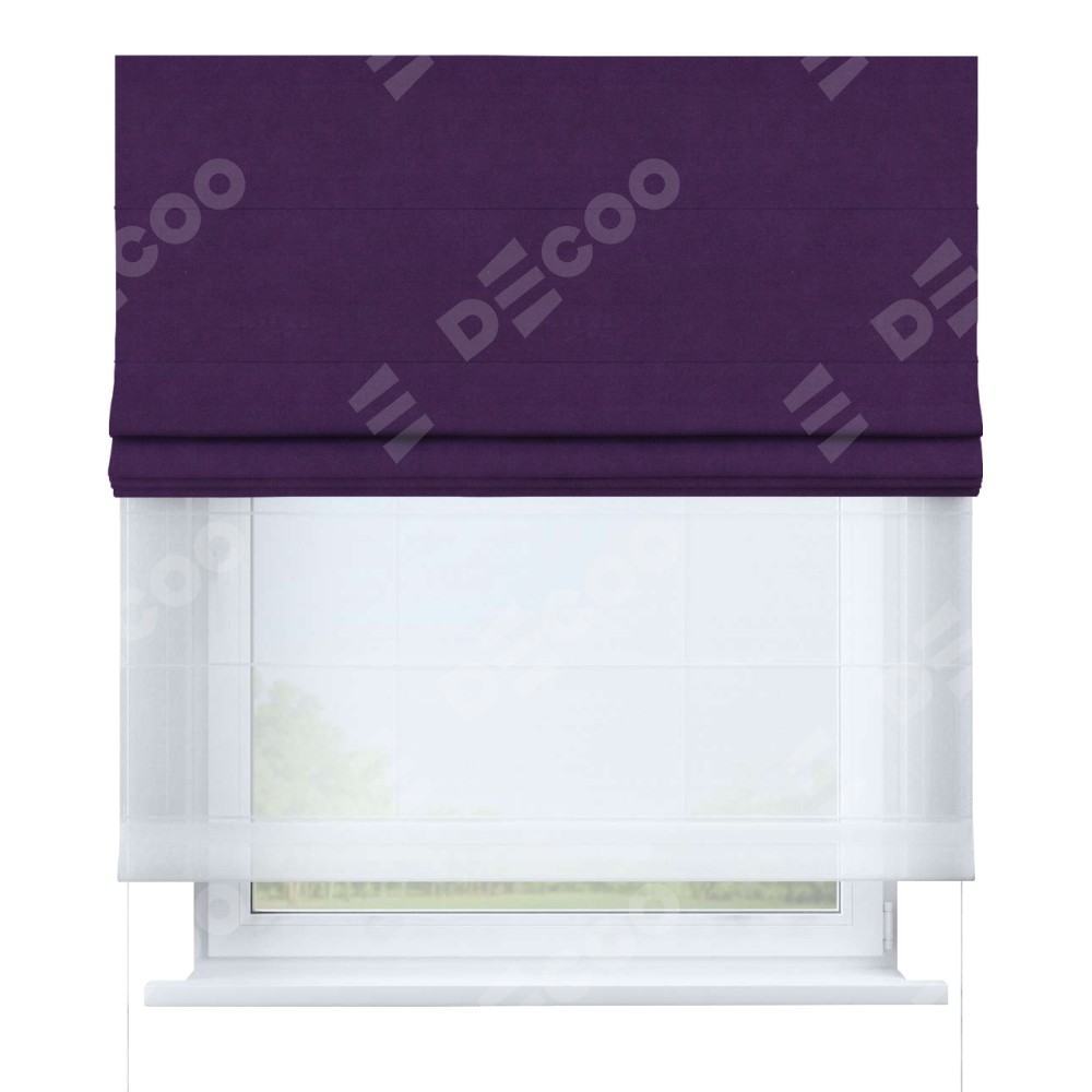 Римская штора день-ночь производителя «Cortin», используется для проёма, пошита из двух полотен, с лицевой стороны вельвет тёмно-фиолетовый артикул 17753, вторая ткань тюль (по стандарту комплектуется тюль белого цвета артикул V-01). Имеет универсальный механизм и подходит для монтажа: на потолок, на стену и в нишу.