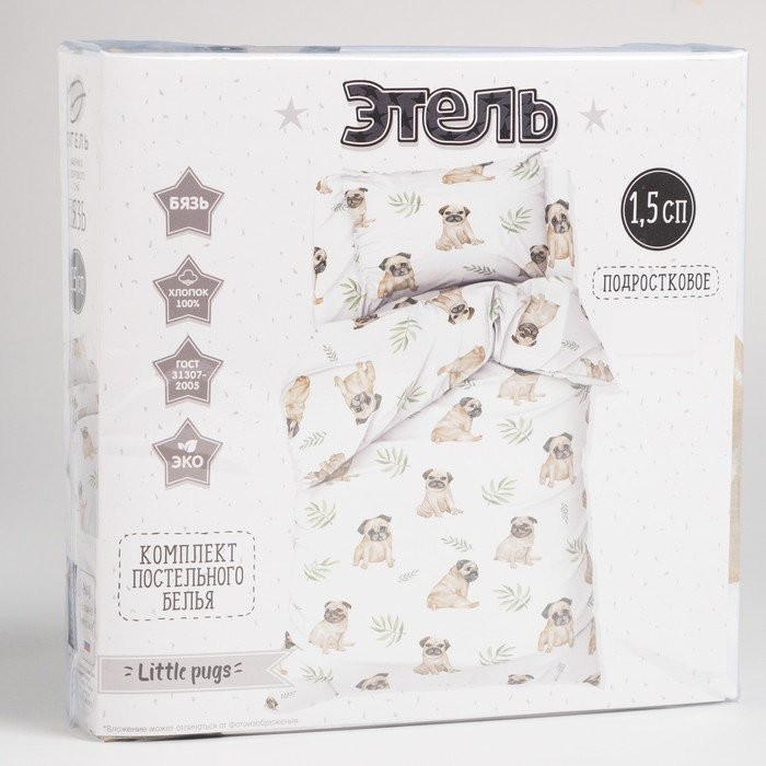 Постельное бельё Этель 1,5 сп «Мопсы» 143×215 см, 150×214 см, 50×70 см -1 шт, 100% хлопок, бязь