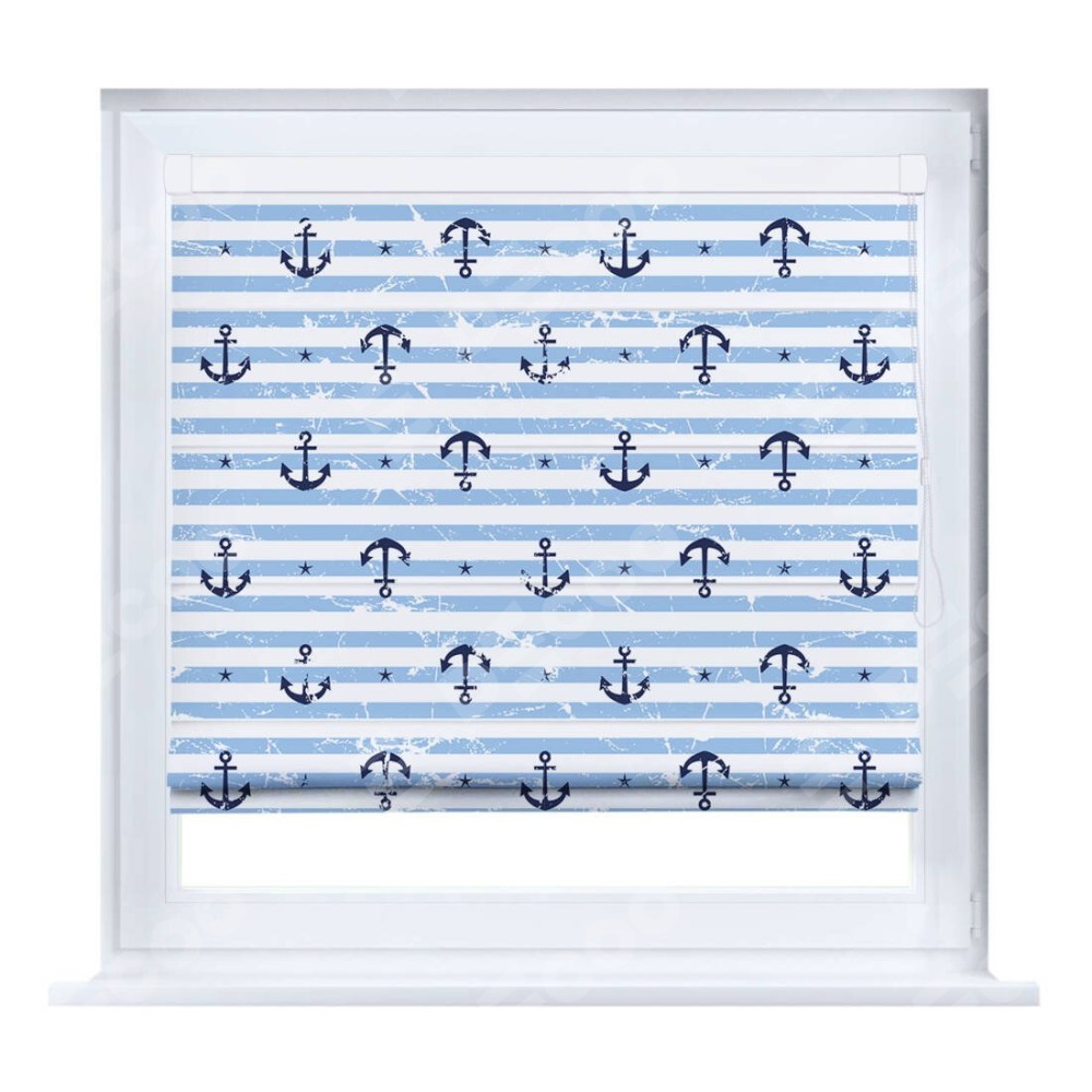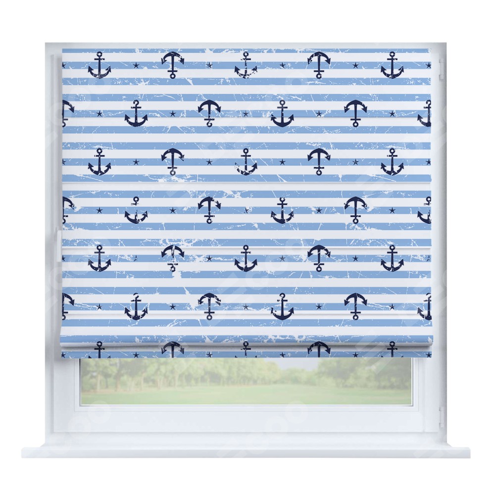 Римская штора производителя «Cortin», устанавливается на створку окна, пошита из ткани блэкаут с нанесением сублимационной печати «Полоски и якори». Штора шьётся по индивидуальным размерам, для данного типа римской шторы возможная ширина от 35 до 150 см., высота до 250 см.