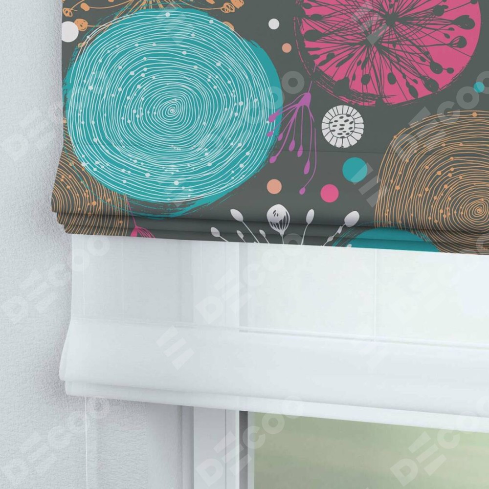 Римская штора день-ночь производителя «Cortin», используется для проёма, пошита из двух полотен, с лицевой блэкаут с нанесением сублимационной печати «Милый гранж», вторая ткань тюль (по стандарту комплектуется тюль белого цвета артикул V-01). Имеет универсальный механизм и подходит для монтажа: на потолок, на стену и в нишу.