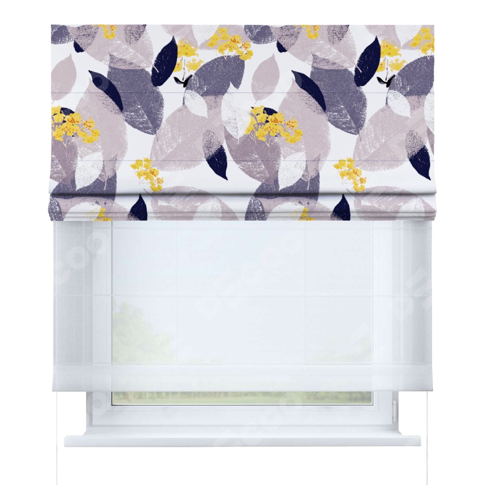 Римская штора день-ночь производителя «Cortin», используется для проёма, пошита из двух полотен, с лицевой блэкаут с нанесением сублимационной печати «Листопад», вторая ткань тюль (по стандарту комплектуется тюль белого цвета артикул V-01). Имеет универсальный механизм и подходит для монтажа: на потолок, на стену и в нишу.