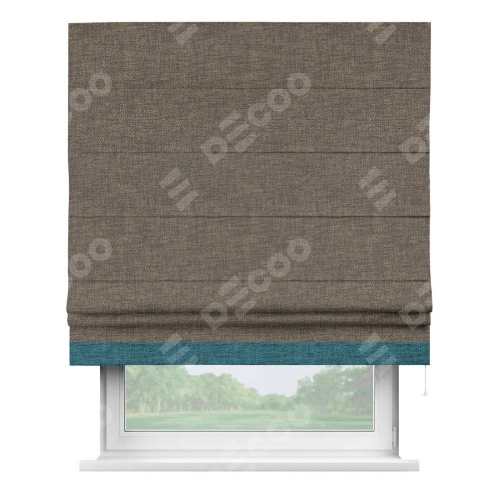 Римская штора производителя «Cortin», используется для проёма, пошита из ткани рогожка димаут коричневый, артикул 80420. Отделка шторы кантом «Джестер», ткань для канта используется из рогожки димаут разной расцветки на выбор. Имеет универсальный механизм и подходит для монтажа: на потолок, на стену и в нишу.