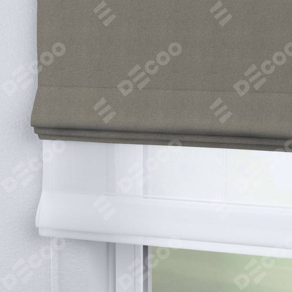 Римская штора день-ночь производителя «Cortin», используется для проёма, пошита из двух полотен, с лицевой стороны лён димаут серо-зелёный артикул 00003, вторая ткань тюль (по стандарту комплектуется тюль белого цвета артикул V-01). Имеет универсальный механизм и подходит для монтажа: на потолок, на стену и в нишу.