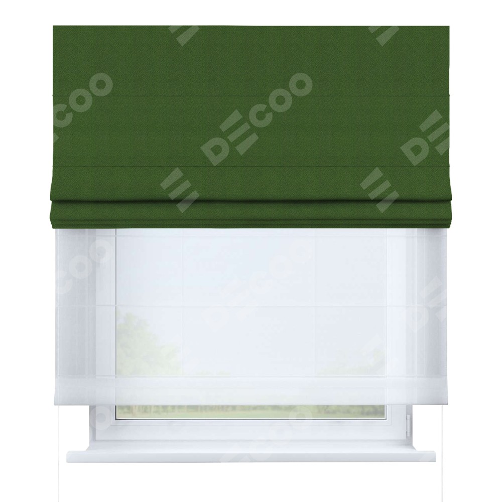 Римская штора день-ночь производителя «Cortin», используется для проёма, пошита из двух полотен, с лицевой стороны блэкаут однотонный зелёный перламутр артикул 81859п, вторая ткань тюль (по стандарту комплектуется тюль белого цвета артикул V-01). Имеет универсальный механизм и подходит для монтажа: на потолок, на стену и в нишу.