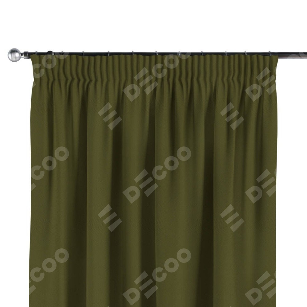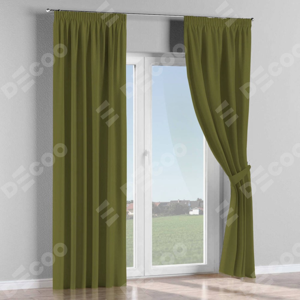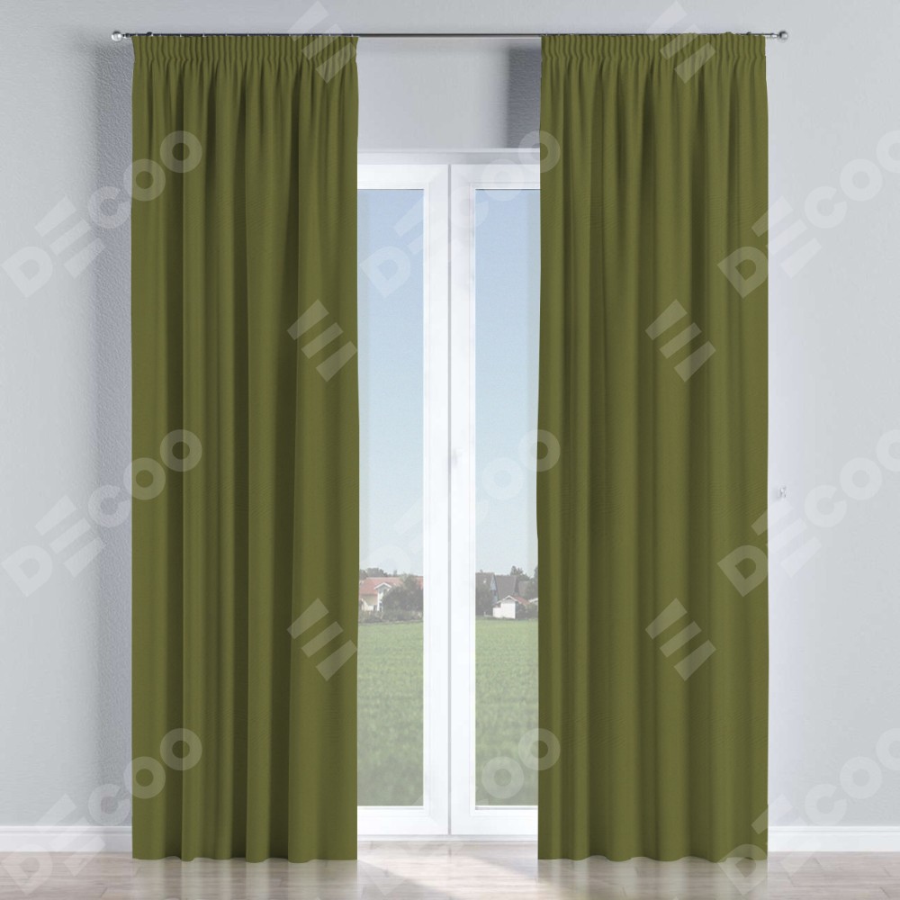Комплект прямых штор, от производителя «Cortin», пошиты из ткани блэкаут однотонный зелёный, артикул ткани 81859. С изнаночной стороны в верхней части штор пристрачивается шторная лента с декоративными складками «Карандаш». Для создания элегантных складок прямые шторы шьются по стандарту с коэффициентом 1:2 (на 100 см. ширины проёма 200 см. ширины ткани).