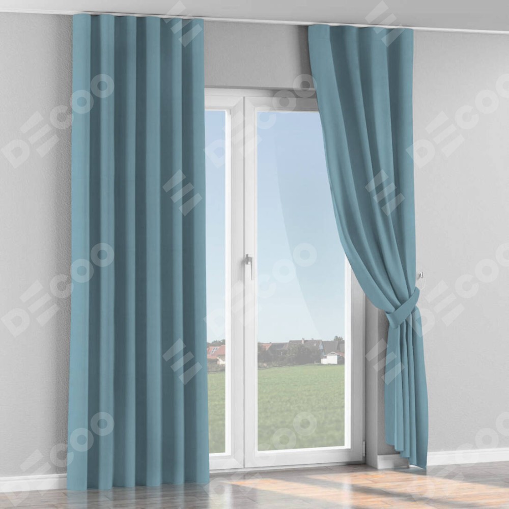 Комплект прямых штор, от производителя «Cortin», пошиты из ткани блэкаут однотонный серо-голубой, артикул ткани 29327. С изнаночной стороны в верхней части штор пристрачивается шторная лента с декоративными складками «Волна». Для создания элегантных складок прямые шторы шьются по стандарту с коэффициентом 1:2 (на 100 см. ширины проёма 200 см. ширины ткани).