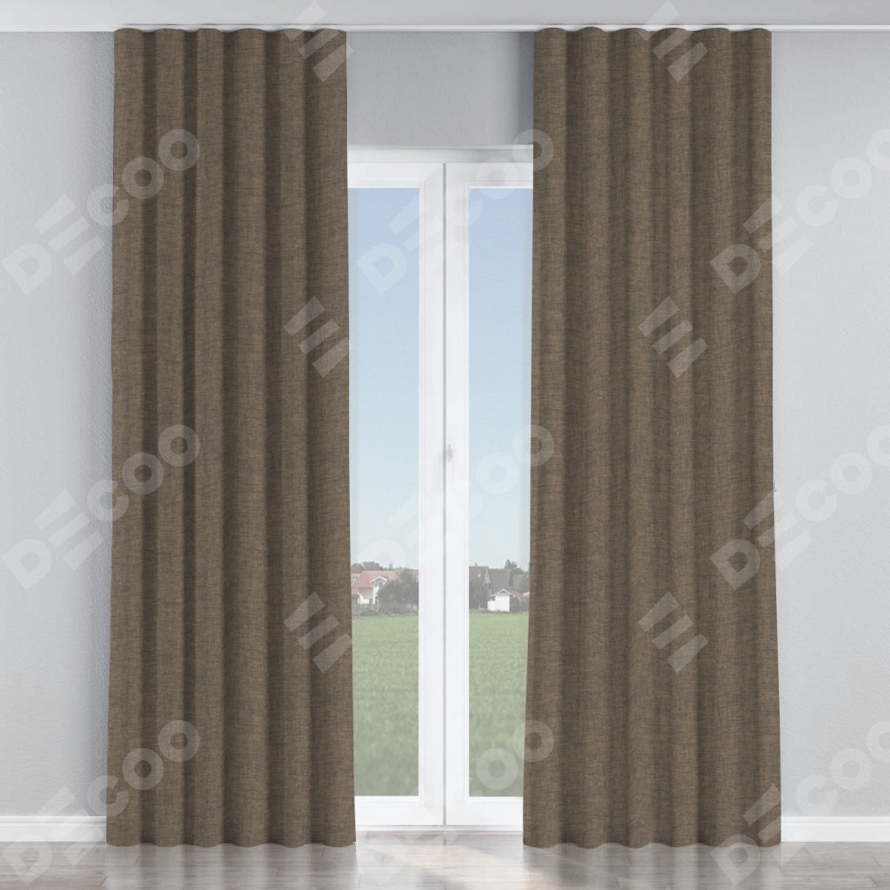 Комплект прямых штор, от производителя «Cortin», пошиты из ткани рогожка димаут коричневый, артикул ткани 80420. С изнаночной стороны в верхней части штор пристрачивается шторная лента с декоративными складками «Волна». Для создания элегантных складок прямые шторы шьются по стандарту с коэффициентом 1:2 (на 100 см. ширины проёма 200 см. ширины ткани).