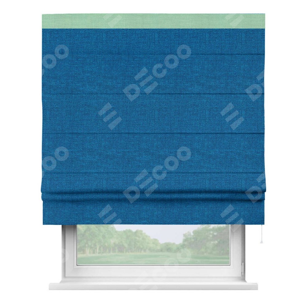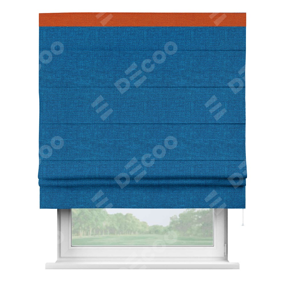 Римская штора производителя «Cortin», используется для проёма, пошита из ткани лён синий, артикул 63742. Отделка шторы кантом «Кинг», ткань для канта используется из льна разной расцветки на выбор. Имеет универсальный механизм и подходит для монтажа: на потолок, на стену и в нишу.