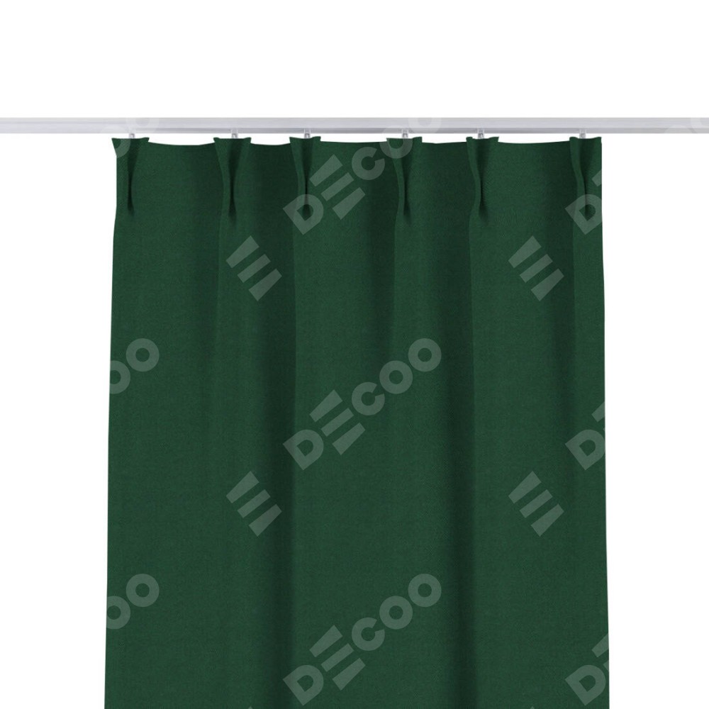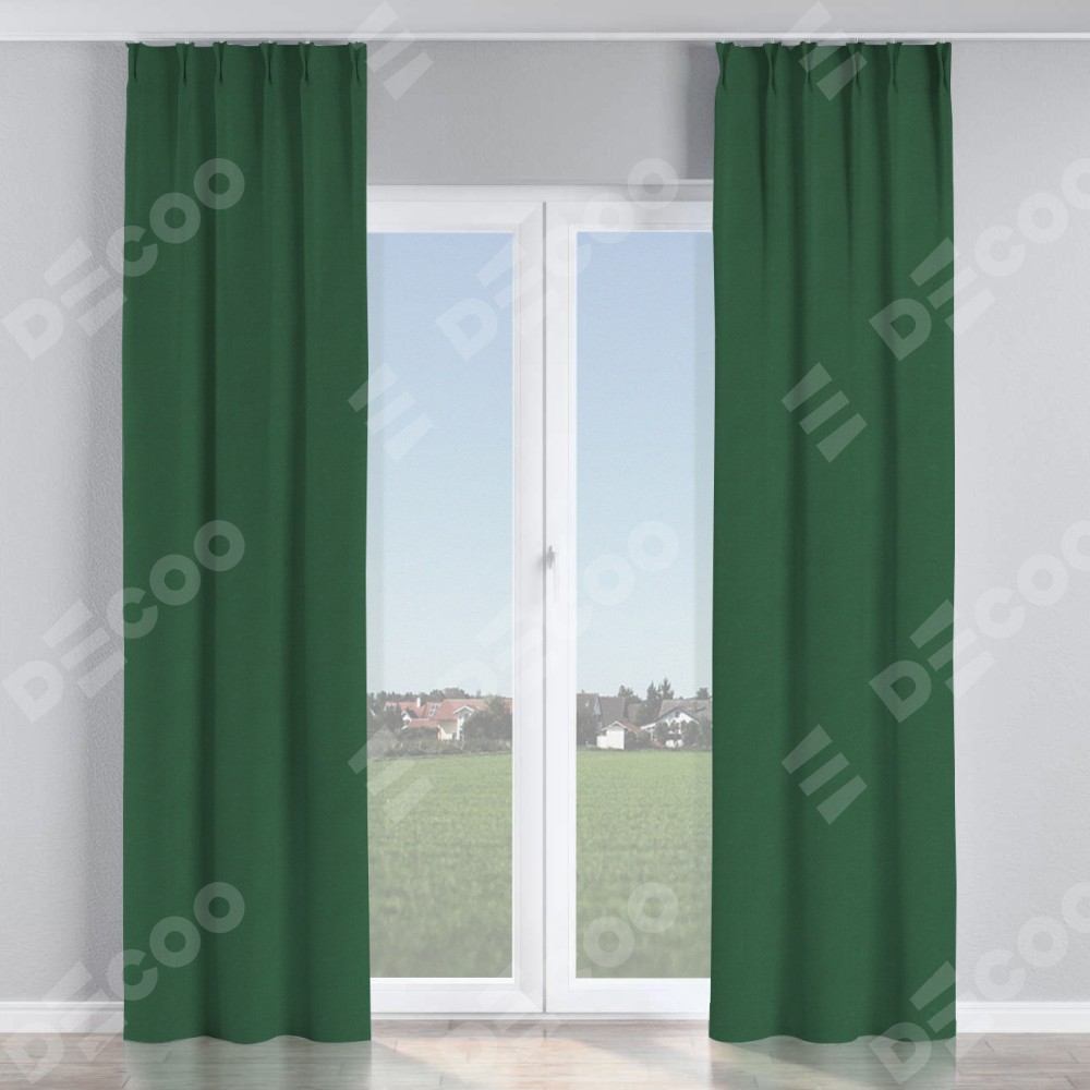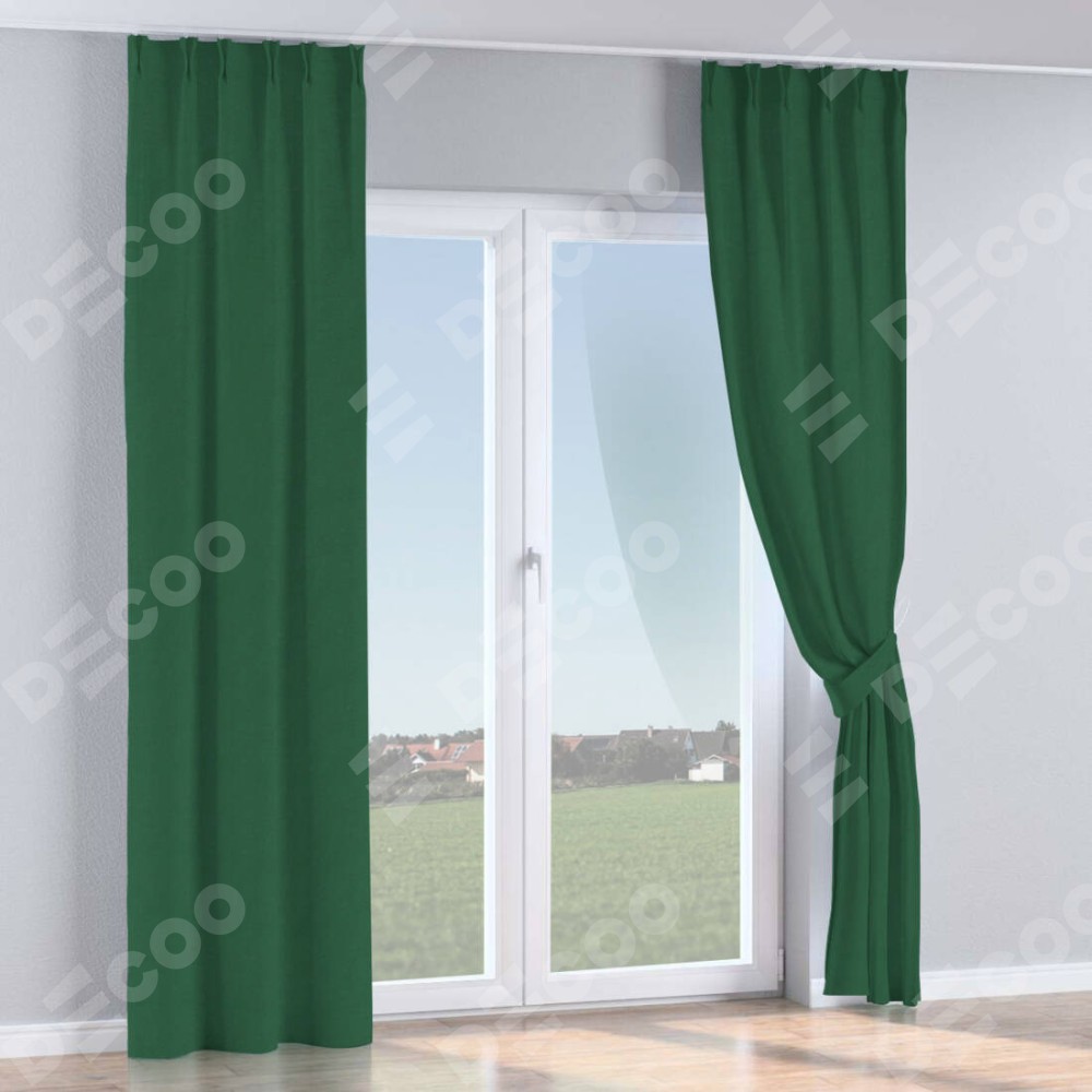 Комплект прямых штор, от производителя «Cortin», пошиты из ткани лён димаут тёмно-зелёный, артикул ткани 16246. С изнаночной стороны в верхней части штор пристрачивается шторная лента с декоративными складками «Кустик». Для создания элегантных складок прямые шторы шьются по стандарту с коэффициентом 1:2 (на 100 см. ширины проёма 200 см. ширины ткани).