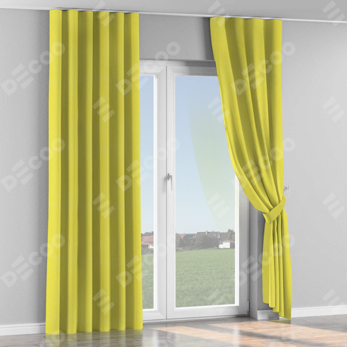 Комплект прямых штор, от производителя «Cortin», пошиты из ткани вельвет светло-желтый, артикул ткани 30997. С изнаночной стороны в верхней части штор пристрачивается шторная лента с декоративными складками «Волна». Для создания элегантных складок прямые шторы шьются по стандарту с коэффициентом 1:2 (на 100 см. ширины проёма 200 см. ширины ткани).