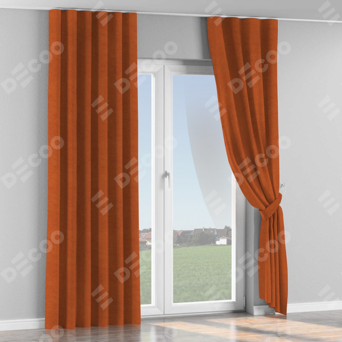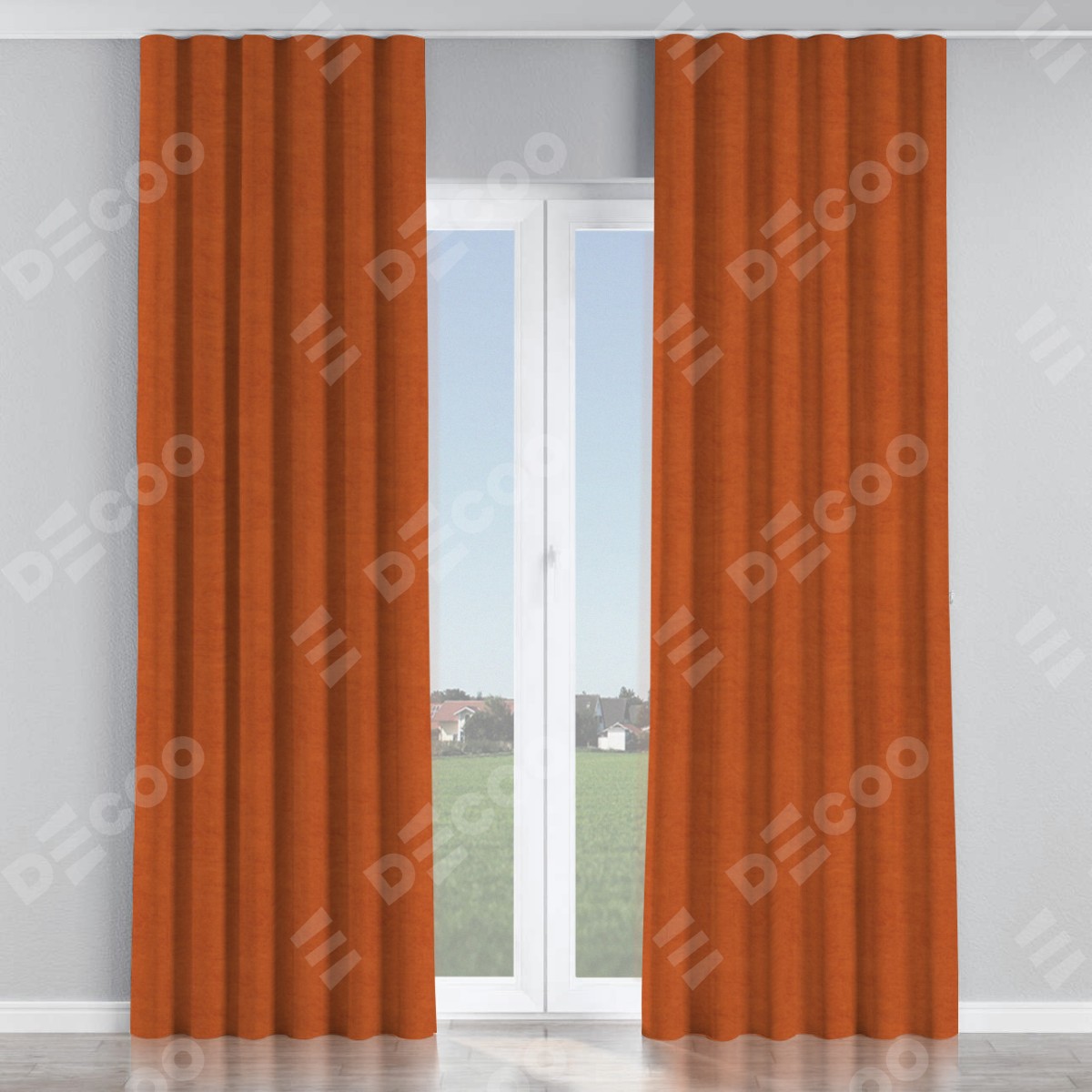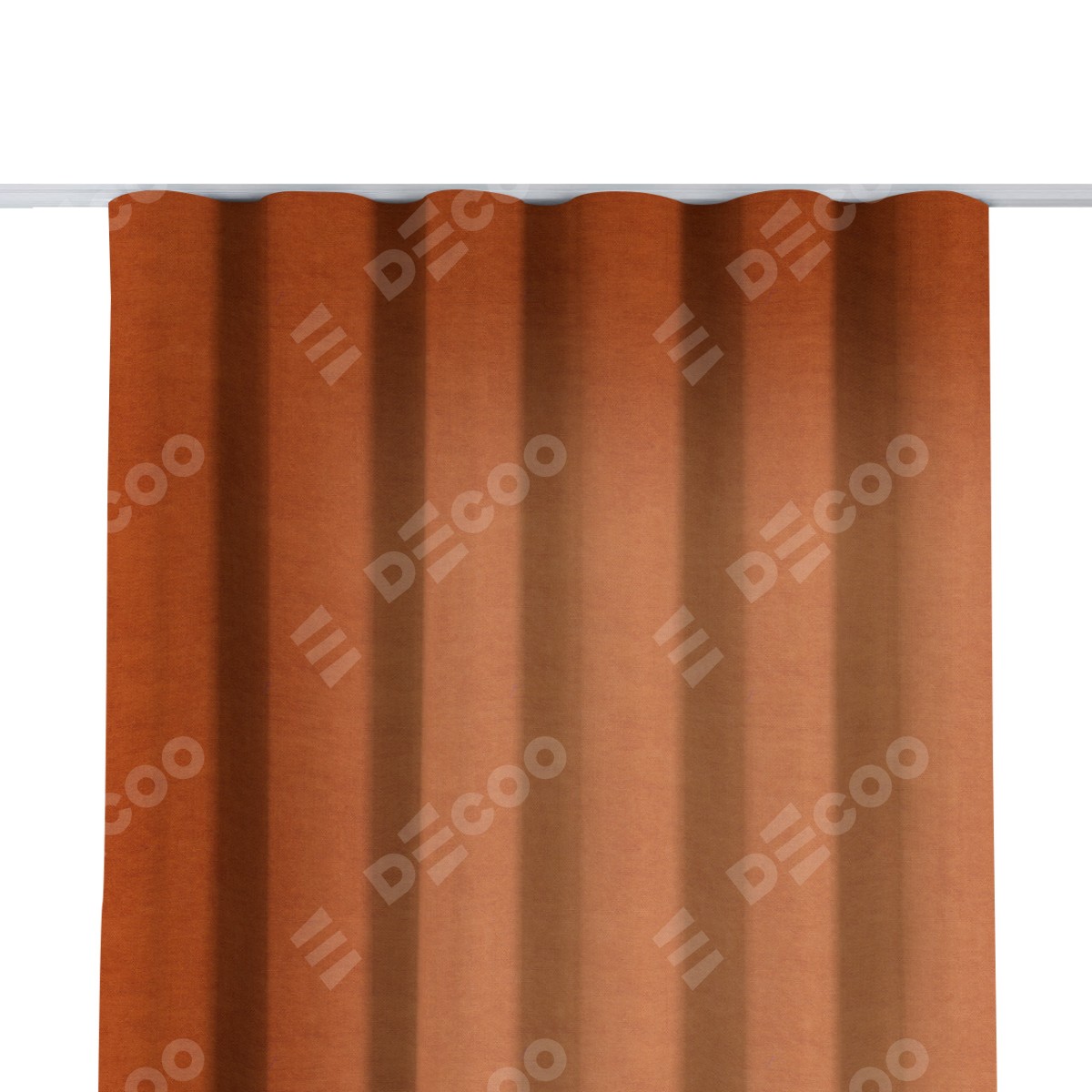 Комплект прямых штор, от производителя «Cortin», пошиты из ткани вельвет терракотовый, артикул ткани 85548. С изнаночной стороны в верхней части штор пристрачивается шторная лента с декоративными складками «Волна». Для создания элегантных складок прямые шторы шьются по стандарту с коэффициентом 1:2 (на 100 см. ширины проёма 200 см. ширины ткани).