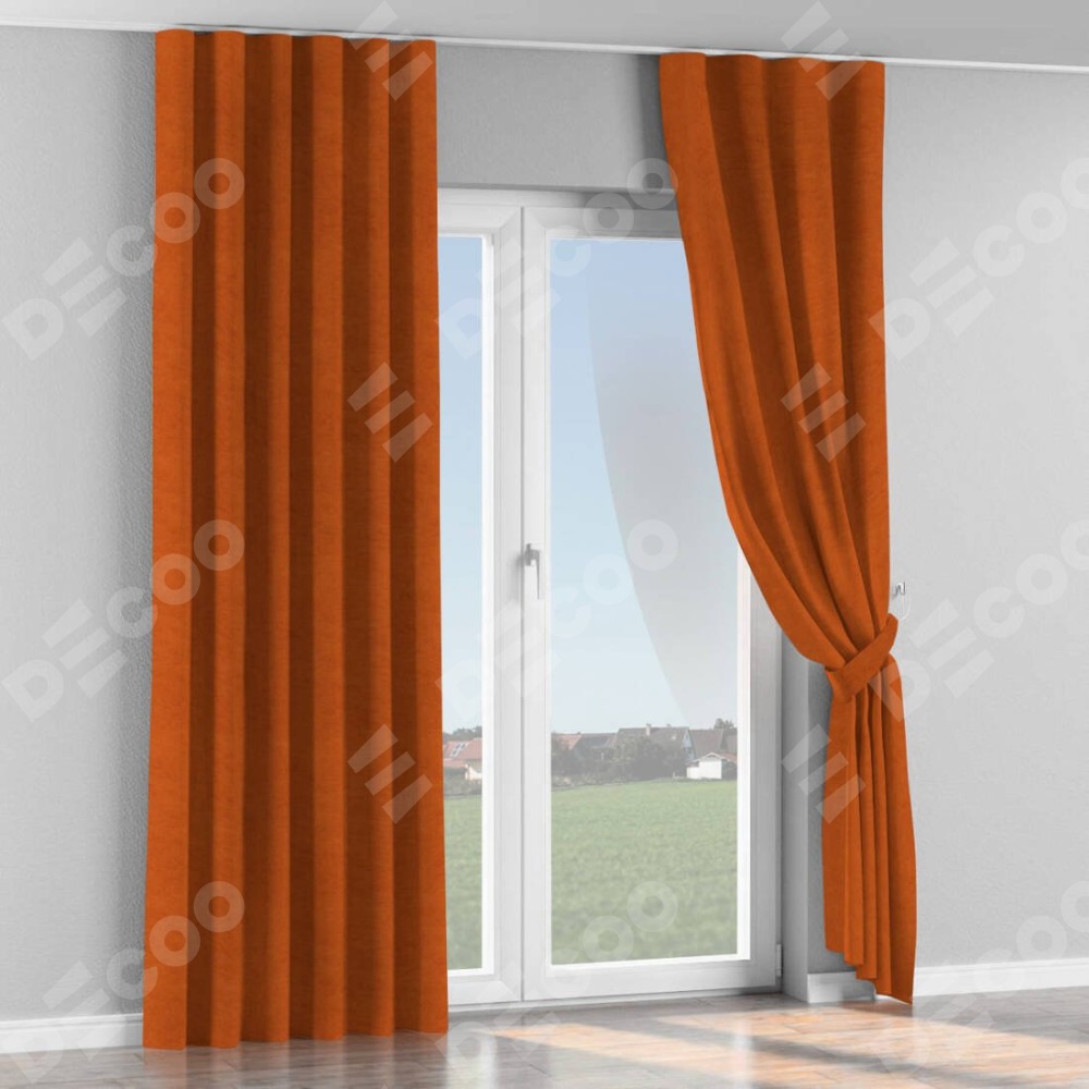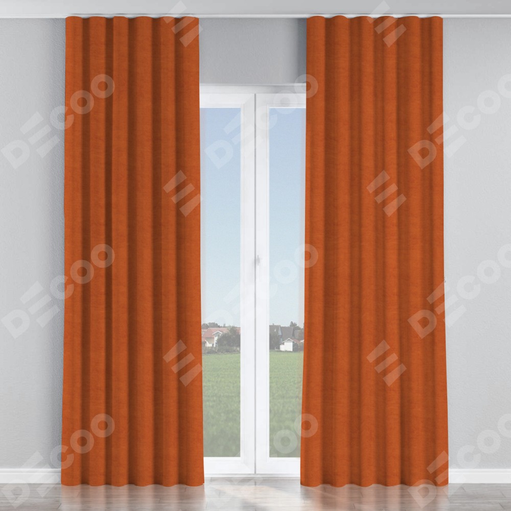 Комплект прямых штор, от производителя «Cortin», пошиты из ткани вельвет терракотовый, артикул ткани 85548. С изнаночной стороны в верхней части штор пристрачивается шторная лента с декоративными складками «Волна». Для создания элегантных складок прямые шторы шьются по стандарту с коэффициентом 1:2 (на 100 см. ширины проёма 200 см. ширины ткани).