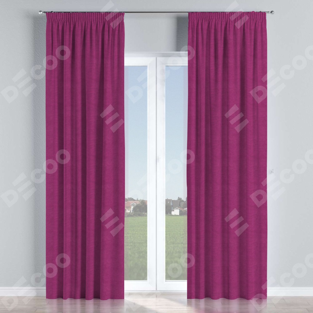 Комплект прямых штор, от производителя «Cortin», пошиты из ткани вельвет фиолетовый, артикул ткани 85552. С изнаночной стороны в верхней части штор пристрачивается шторная лента с декоративными складками «Карандаш». Для создания элегантных складок прямые шторы шьются по стандарту с коэффициентом 1:2 (на 100 см. ширины проёма 200 см. ширины ткани).