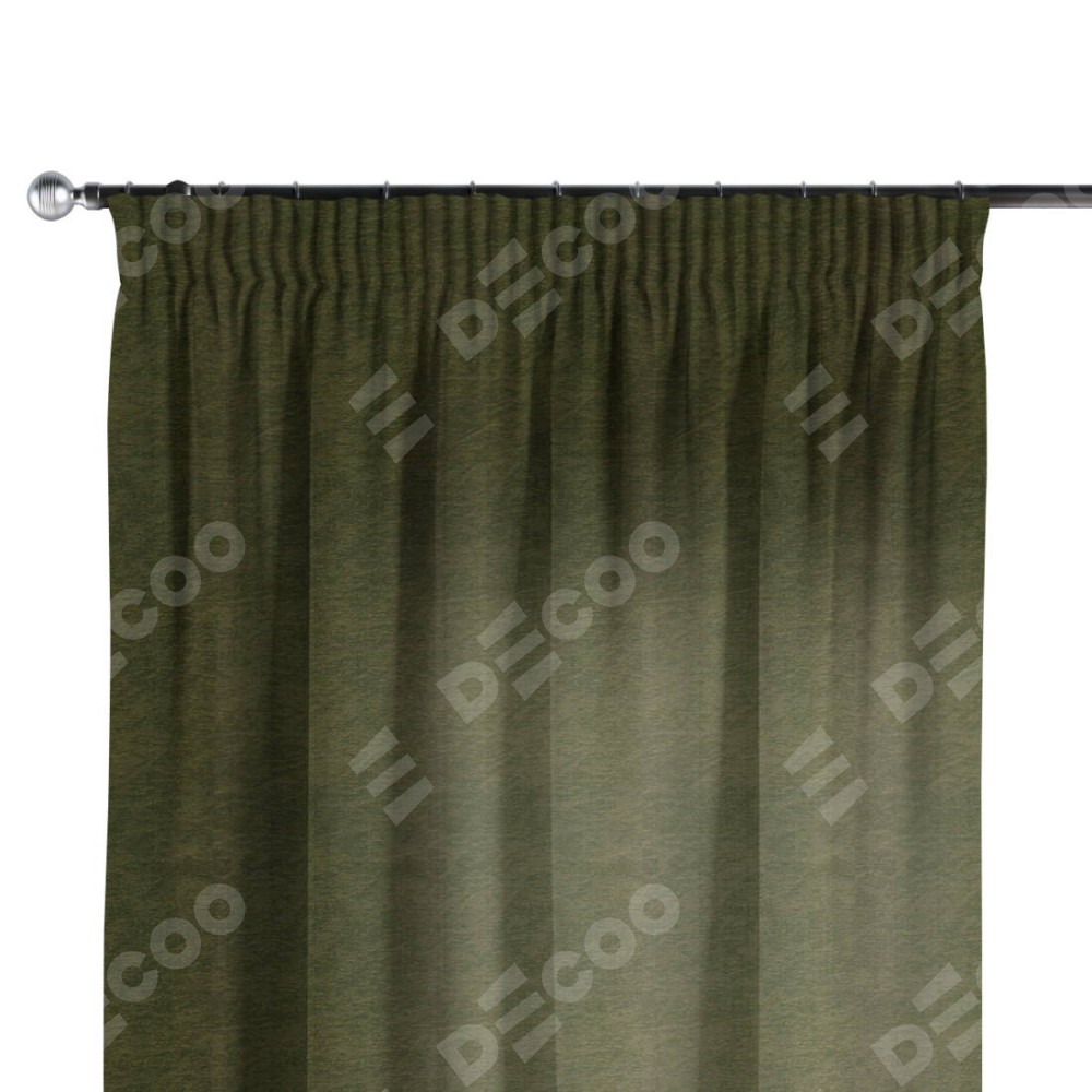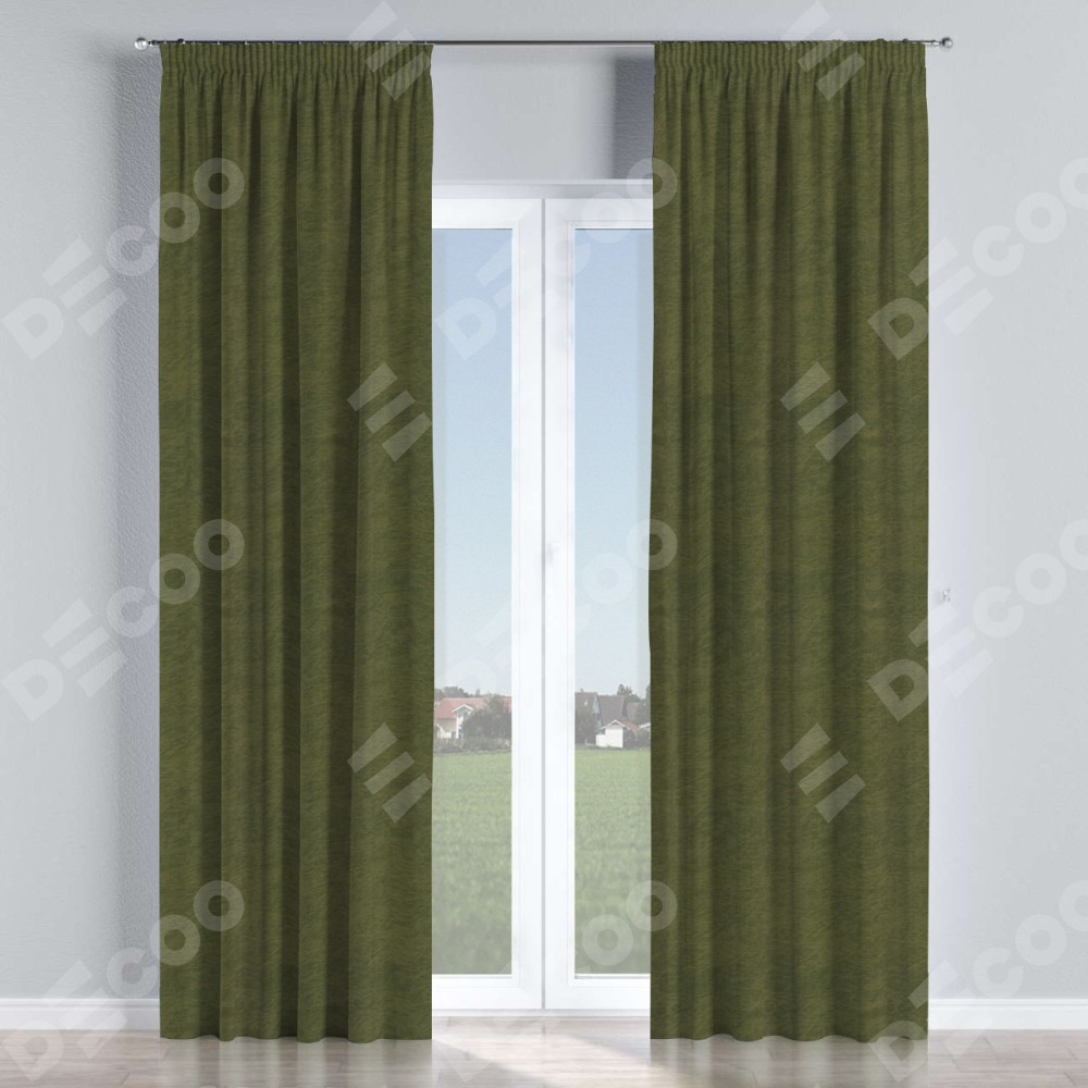 Комплект прямых штор, от производителя «Cortin», пошиты из ткани софт однотонный зелёный, артикул ткани 33110. С изнаночной стороны в верхней части штор пристрачивается шторная лента с декоративными складками «Карандаш». Для создания элегантных складок прямые шторы шьются по стандарту с коэффициентом 1:2 (на 100 см. ширины проёма 200 см. ширины ткани).