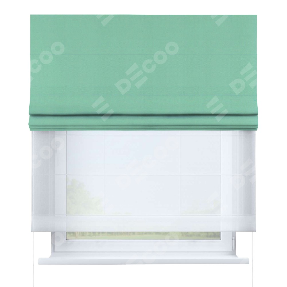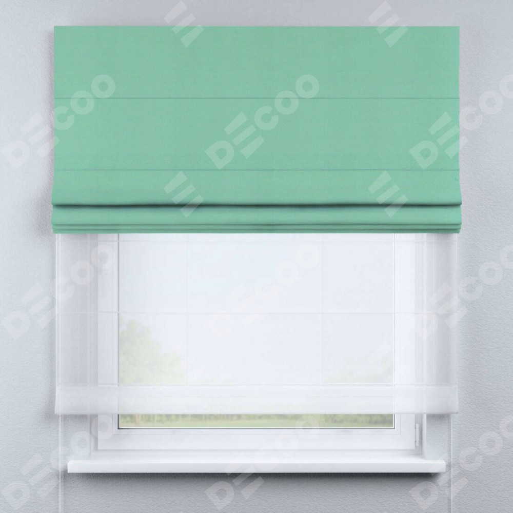 Римская штора день-ночь производителя «Cortin», используется для проёма, пошита из двух полотен, с лицевой стороны pipa блэкаут бирюза артикул 81852, вторая ткань тюль (по стандарту комплектуется тюль белого цвета артикул V-01). Имеет универсальный механизм и подходит для монтажа: на потолок, на стену и в нишу.