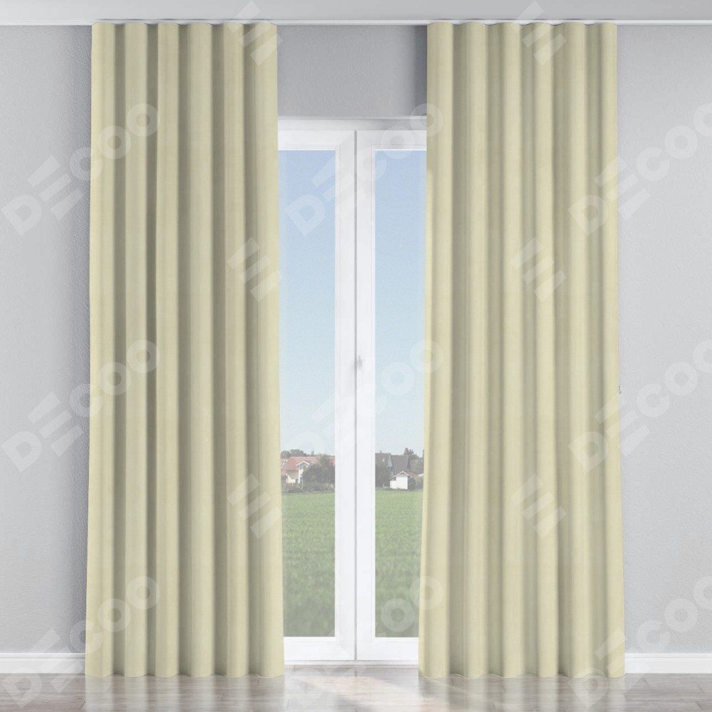 Комплект прямых штор, от производителя «Cortin», пошиты из ткани бархат молочный, артикул ткани 21409. С изнаночной стороны в верхней части штор пристрачивается шторная лента с декоративными складками «Волна». Для создания элегантных складок прямые шторы шьются по стандарту с коэффициентом 1:2 (на 100 см. ширины проёма 200 см. ширины ткани).