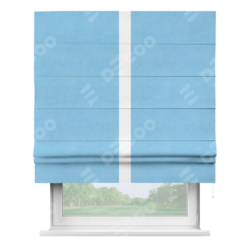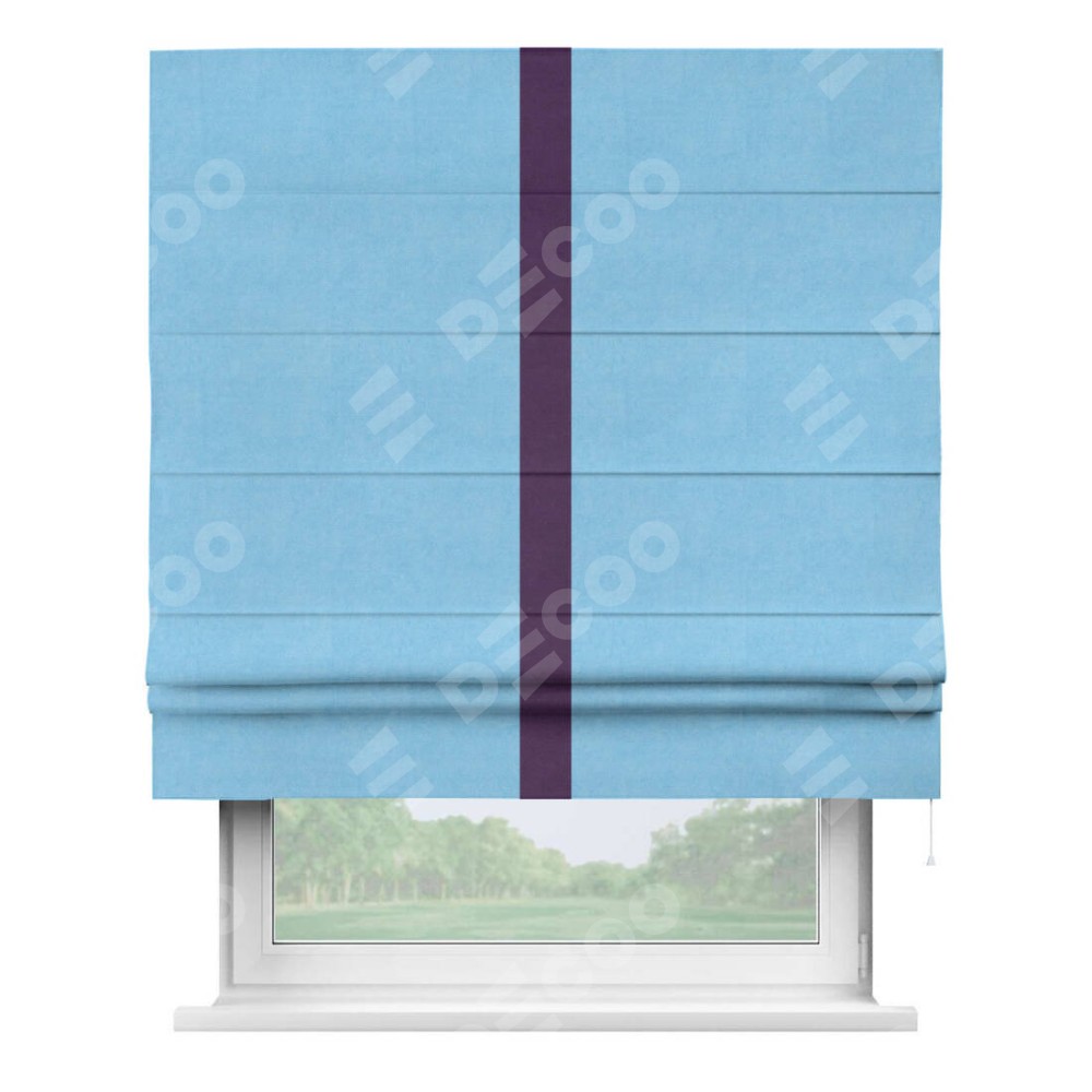 Римская штора производителя «Cortin», используется для проёма, пошита из ткани вельвет голубой, артикул ткани 85544. Отделка шторы кантом «Хайвей», ткань для канта используется из вельвета разной расцветки на выбор. Имеет универсальный механизм и подходит для монтажа: на потолок, на стену и в нишу.