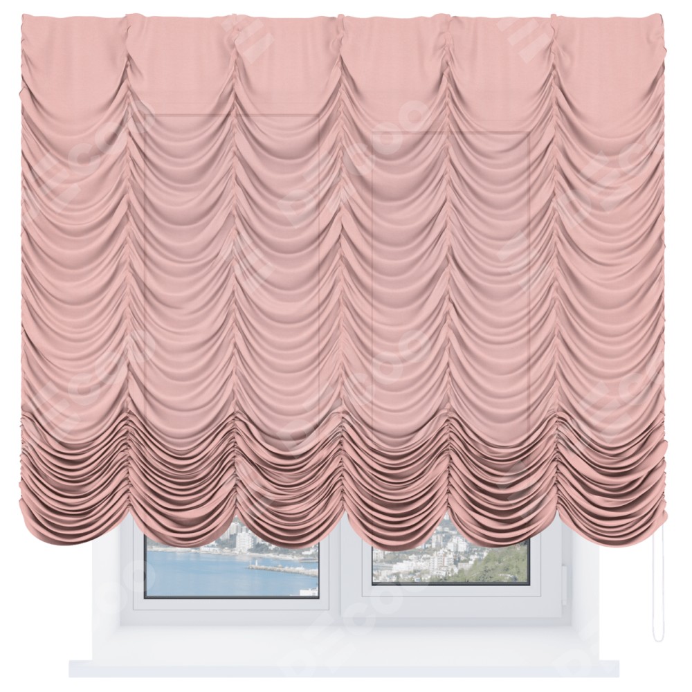 Французская штора производителя «Cortin», используется для проёма, пошита из ткани лён розовый, артикул ткани 00005. Имеет универсальный механизм и подходит для монтажа: на потолок и на стену.