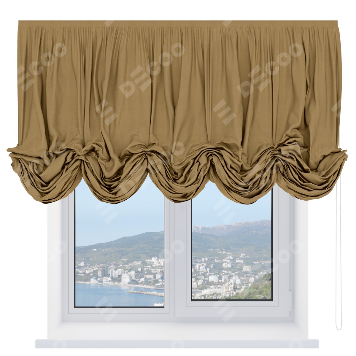 — Для проёма: Замер ширины — к ширине проёма добавьте +10 см. (по +5 см. на каждую сторону); Замер высоты — замерьте габаритную высоту шторы с собранными фестонами (карниз входит в габаритную высоту шторы)