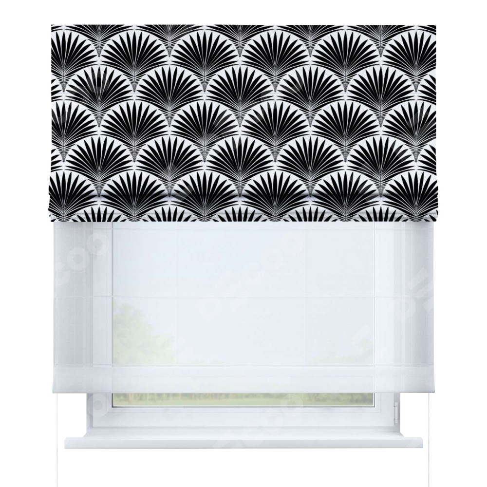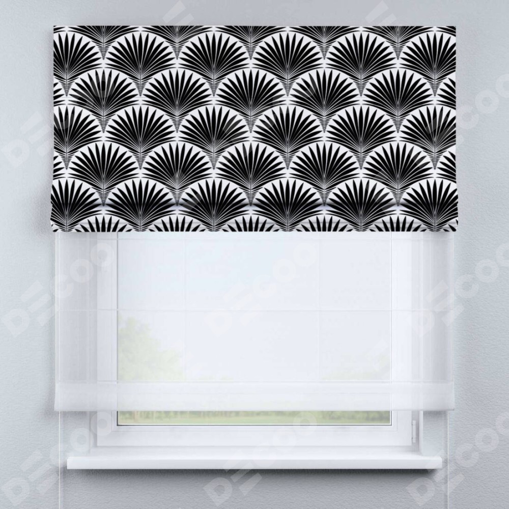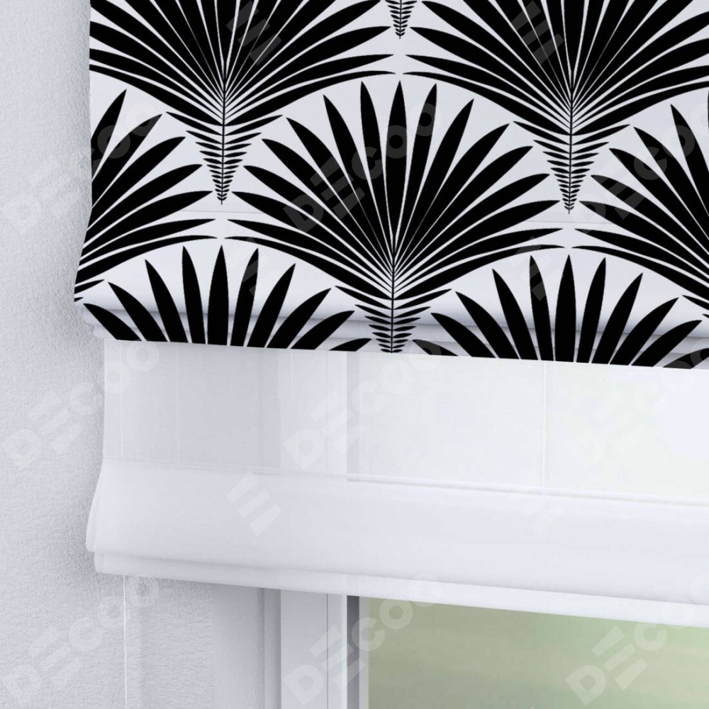 Римская штора день-ночь производителя «Cortin», используется для проёма, пошита из двух полотен, с лицевой блэкаут с нанесением сублимационной печати «Арт-деко листья черный», вторая ткань тюль (по стандарту комплектуется тюль белого цвета артикул V-01). Имеет универсальный механизм и подходит для монтажа: на потолок, на стену и в нишу.