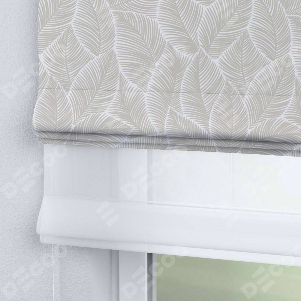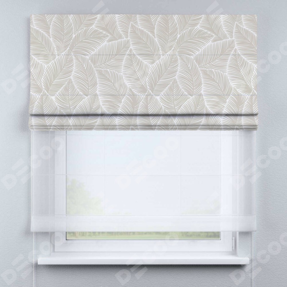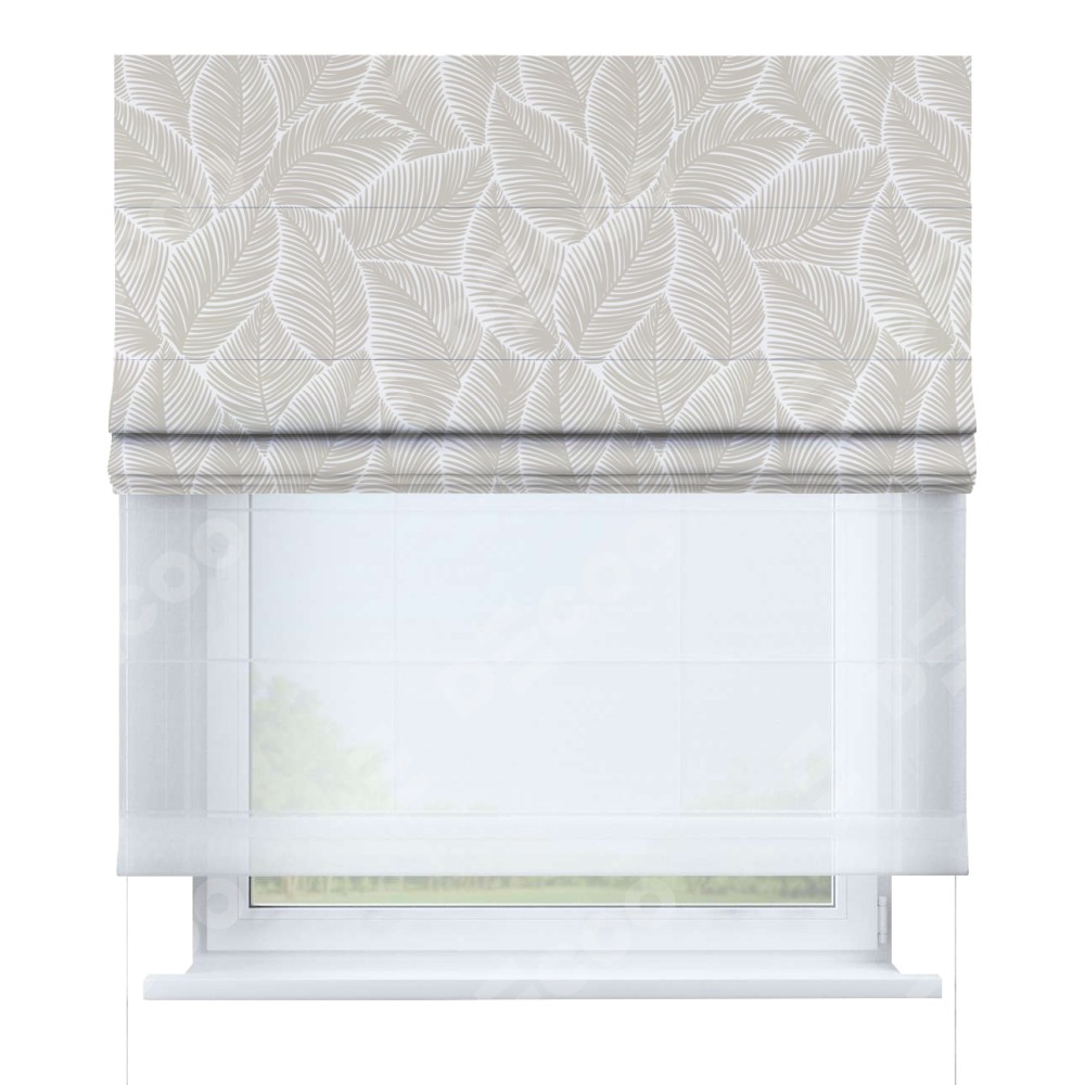Римская штора день-ночь производителя «Cortin», используется для проёма, пошита из двух полотен, с лицевой блэкаут с нанесением сублимационной печати «Бежевые листья», вторая ткань тюль (по стандарту комплектуется тюль белого цвета артикул V-01). Имеет универсальный механизм и подходит для монтажа: на потолок, на стену и в нишу.