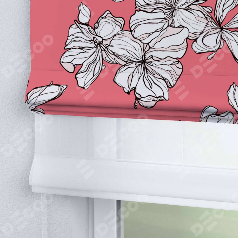 Римская штора день-ночь производителя «Cortin», используется для проёма, пошита из двух полотен, с лицевой блэкаут с нанесением сублимационной печати «Белые цветы», вторая ткань тюль (по стандарту комплектуется тюль белого цвета артикул V-01). Имеет универсальный механизм и подходит для монтажа: на потолок, на стену и в нишу.