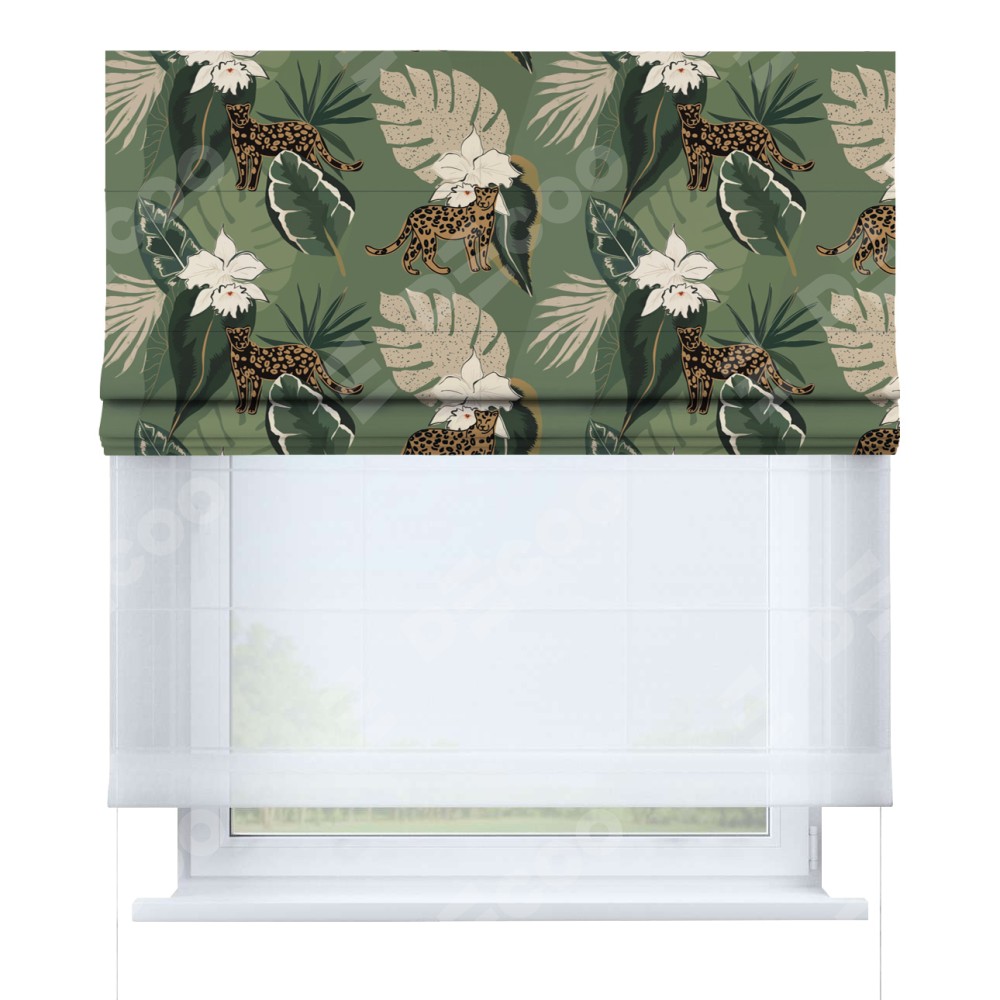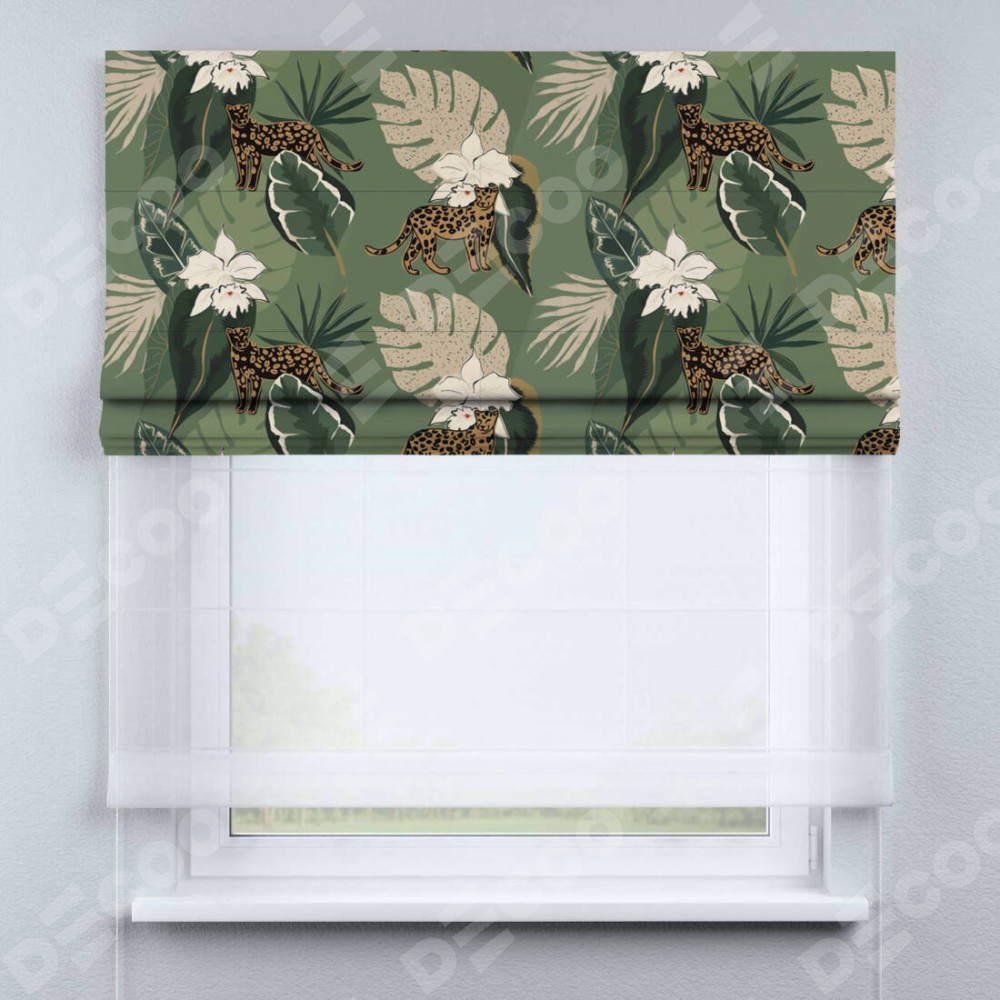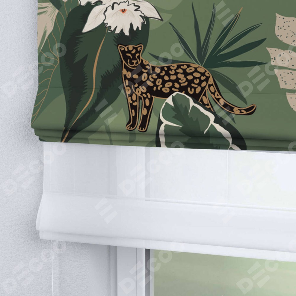Римская штора день-ночь производителя «Cortin», используется для проёма, пошита из двух полотен, с лицевой блэкаут с нанесением сублимационной печати «В тропическом лесу», вторая ткань тюль (по стандарту комплектуется тюль белого цвета артикул V-01). Имеет универсальный механизм и подходит для монтажа: на потолок, на стену и в нишу.