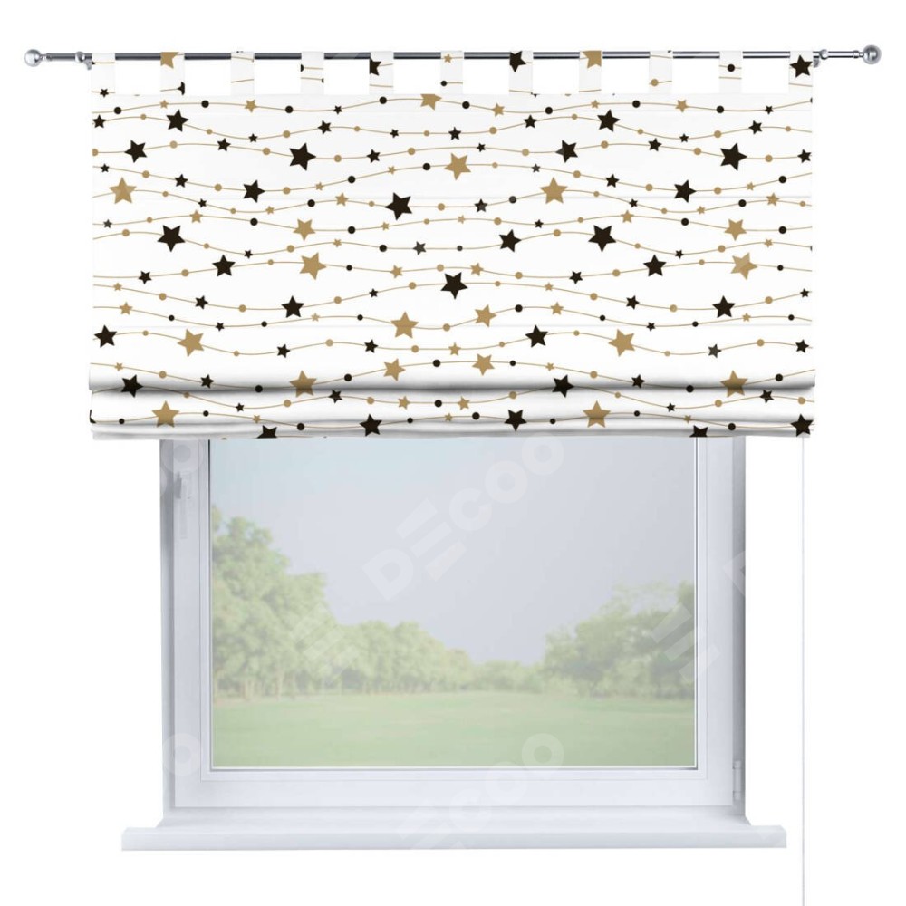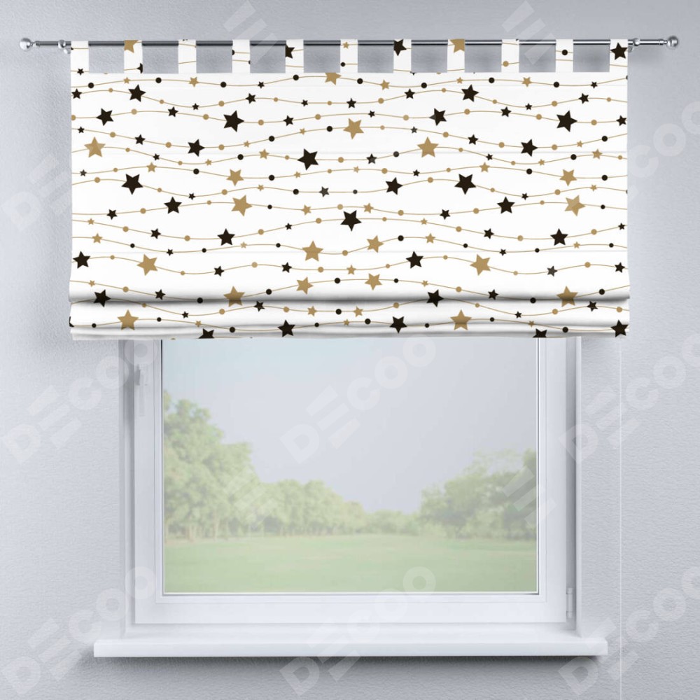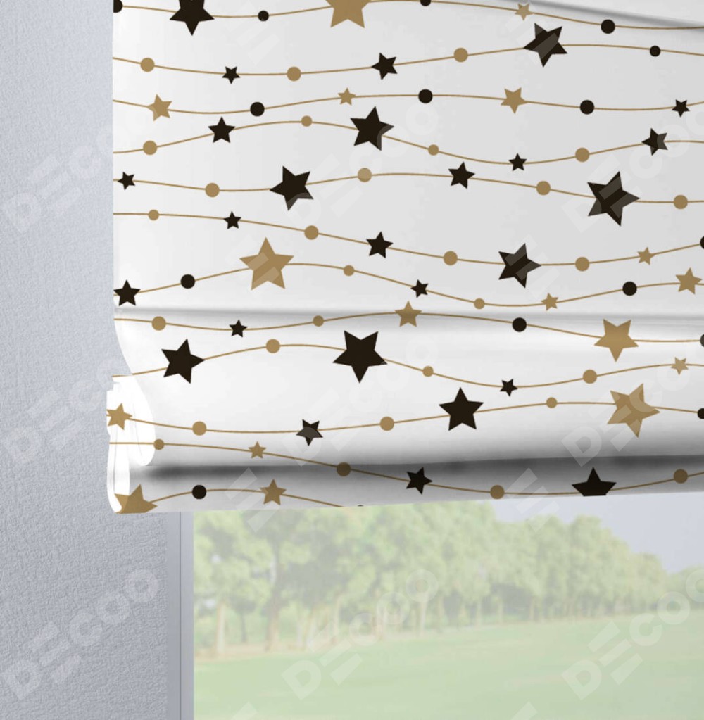 Римская штора производителя «Cortin», используется для проёма, пошита из ткани блэкаут с нанесением сублимационной печати «Звёздная нить». Данная модель пошита на петлях, комплектуется на выбор круглым карнизом и подходит для монтажа на стену. Римская штора на петлях имеет простую систему регулировки высоты, отличительным преимуществом данной модели является простой способ монтажа. Достаточно повесить ее на трубу и штора готова!