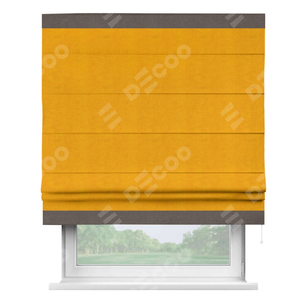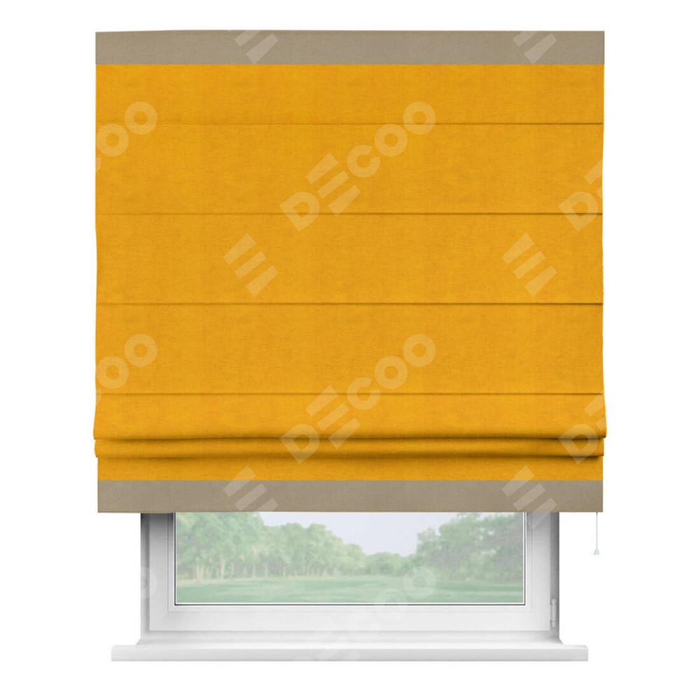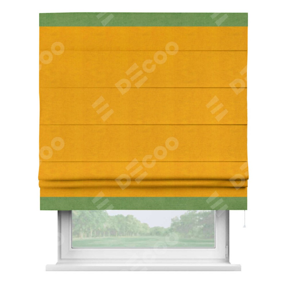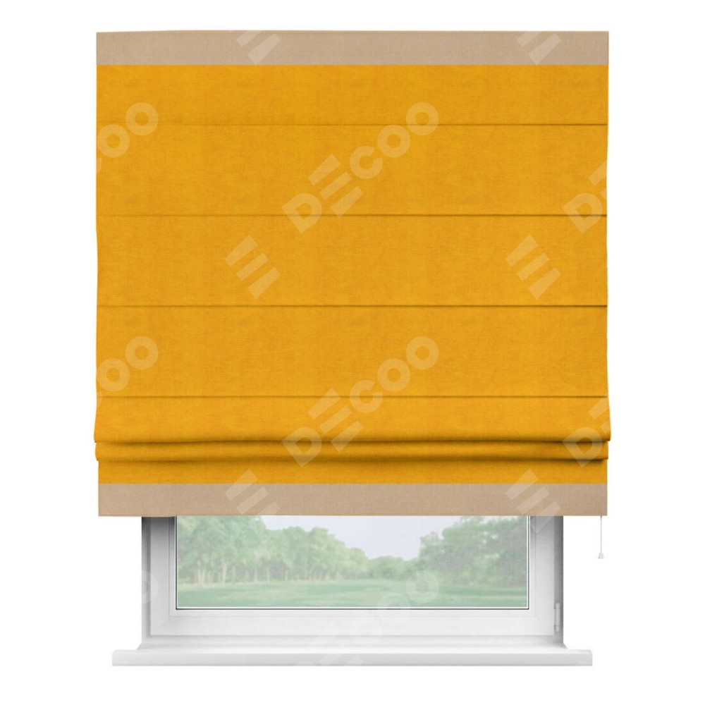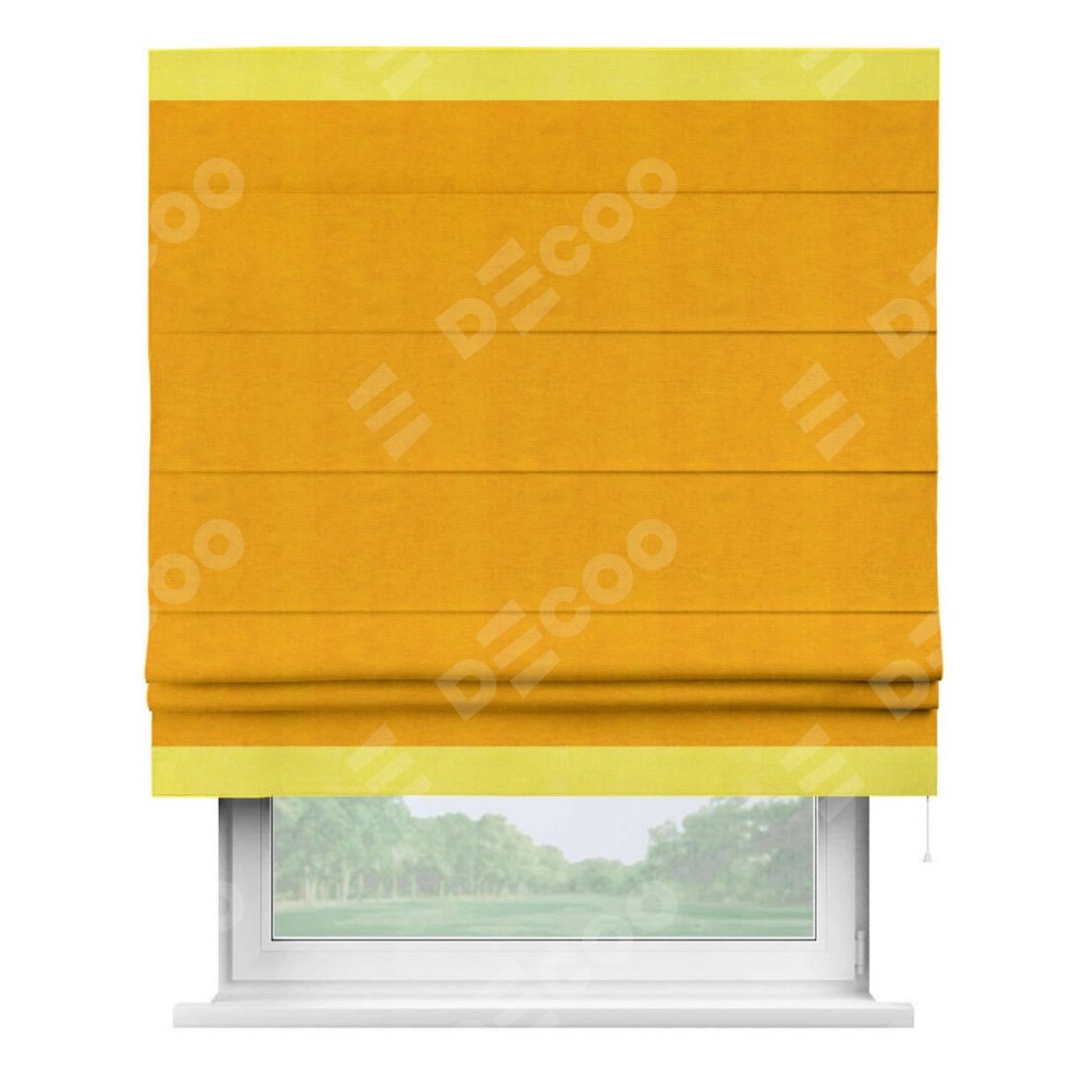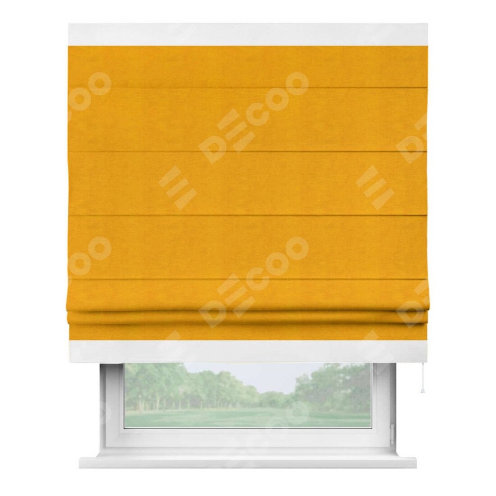 Римская штора производителя «Cortin», используется для проёма, пошита из ткани вельвет желтый, артикул ткани 85547. Отделка шторы кантом «Горизонт», ткань для канта используется из вельвета разной расцветки на выбор. Имеет универсальный механизм и подходит для монтажа: на потолок, на стену и в нишу.