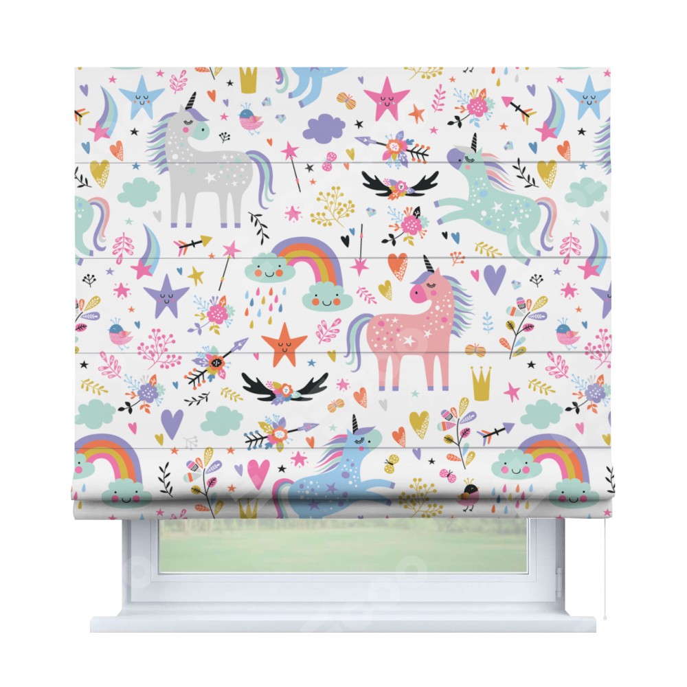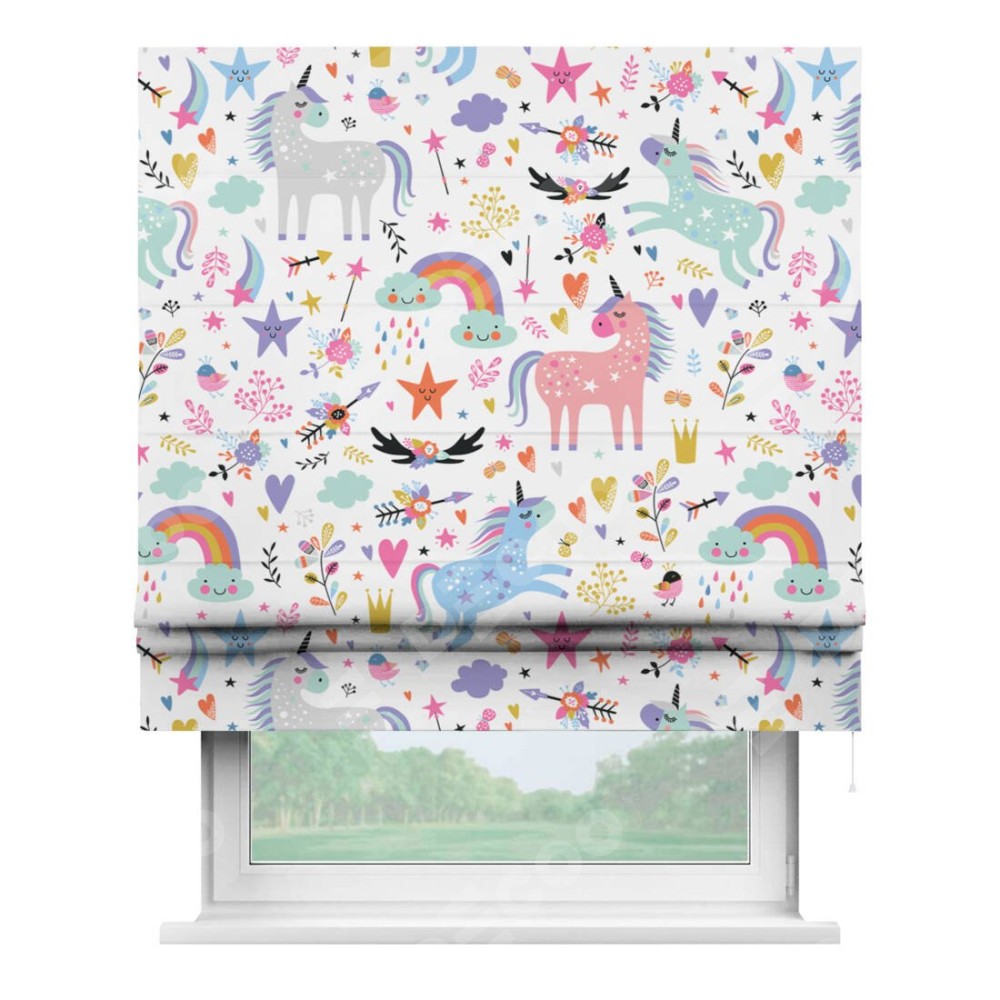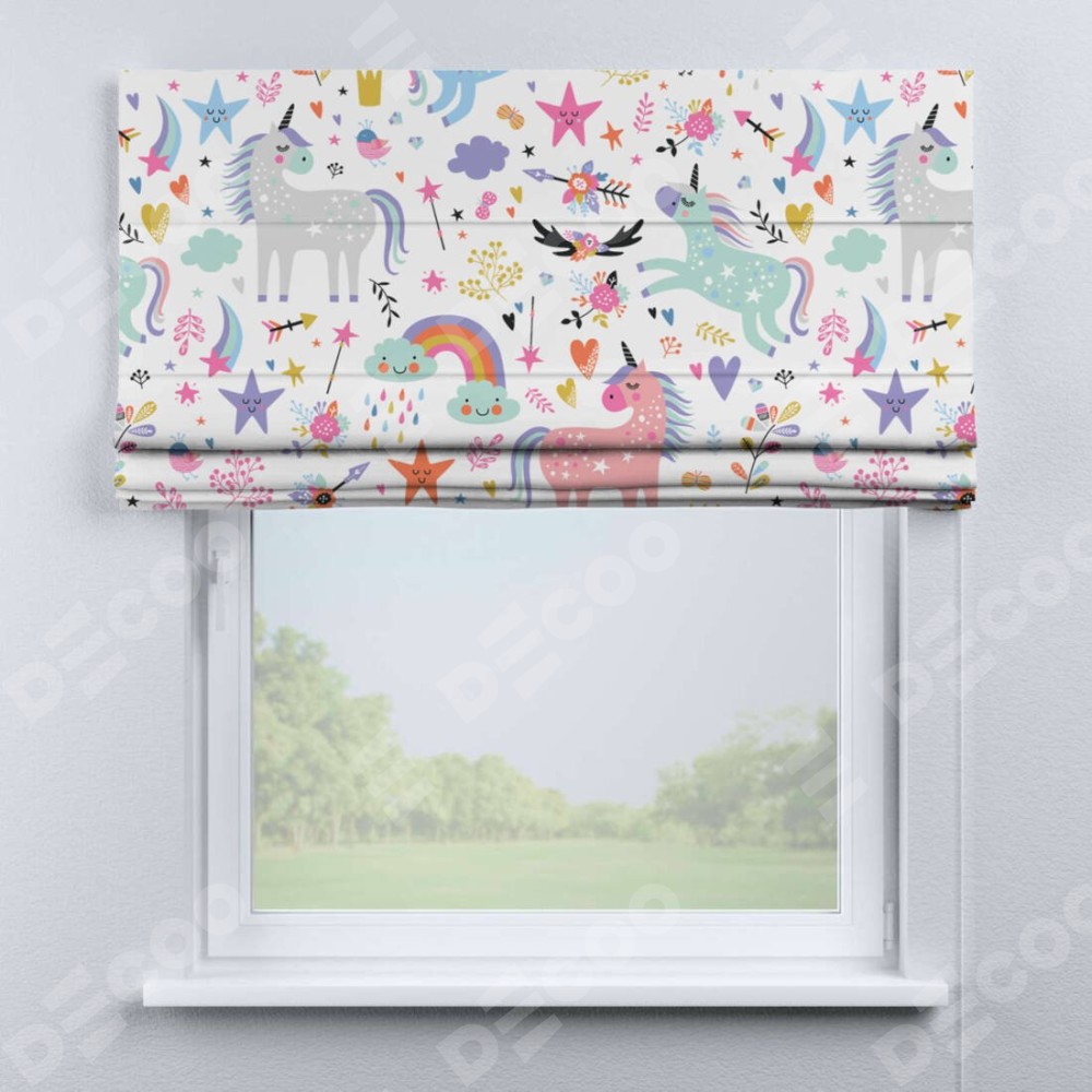 Римская штора производителя «Cortin», используется для проёма, пошита из ткани блэкаут с нанесением сублимационной печати «Радужные единороги». Имеет универсальный механизм и подходит для монтажа: на потолок, на стену и в нишу.