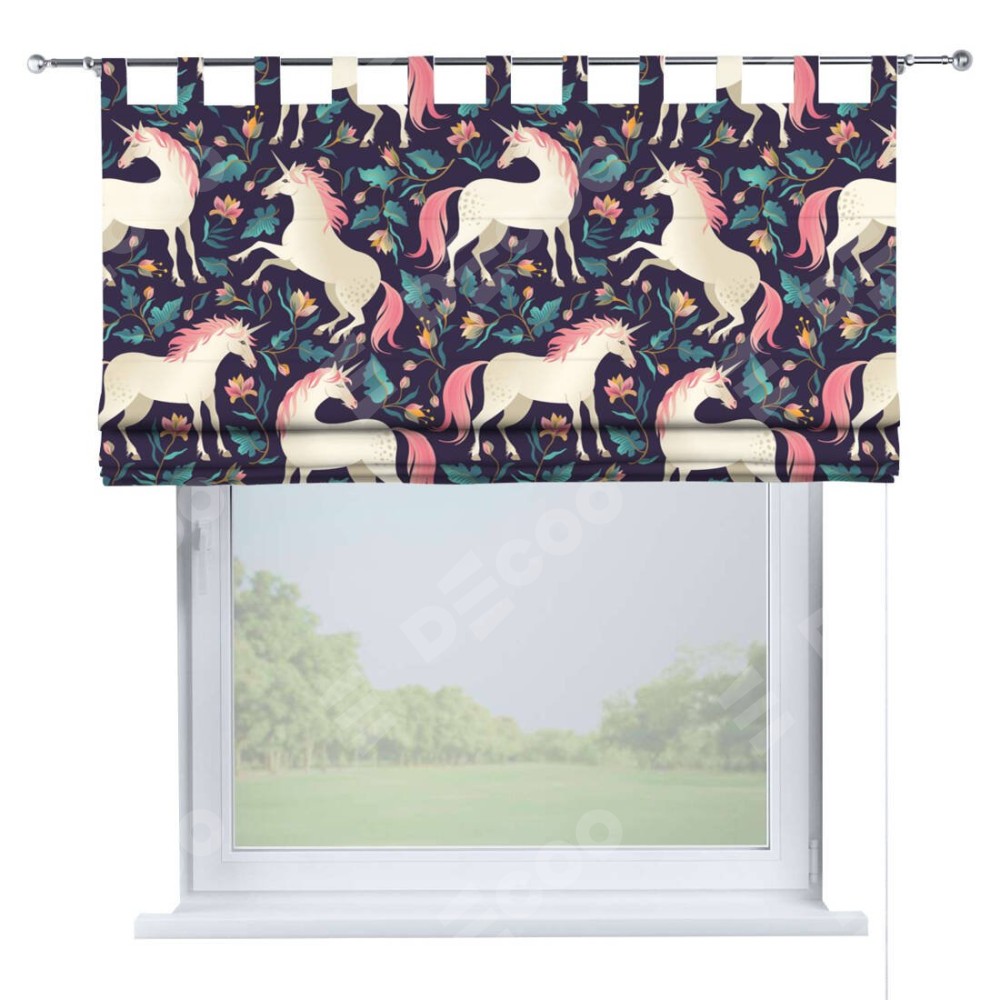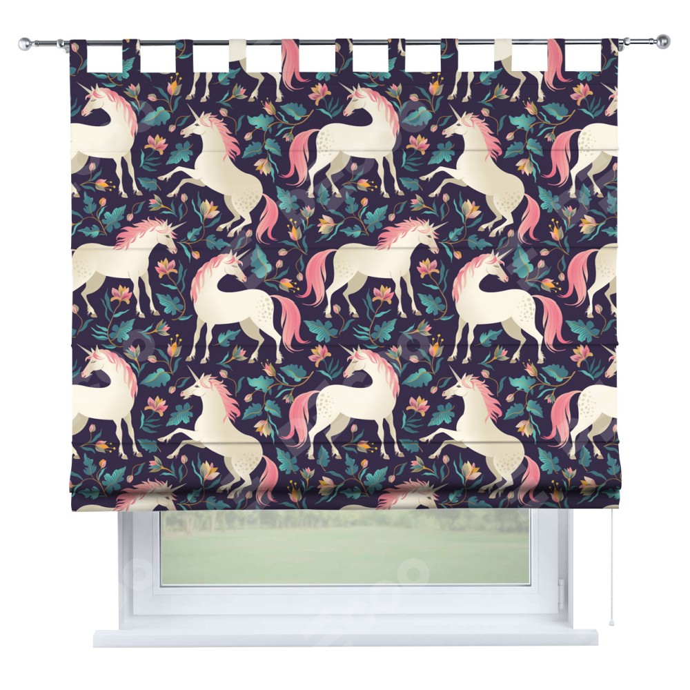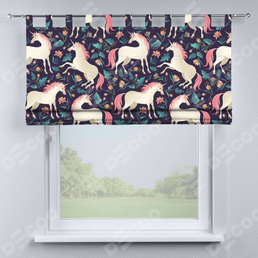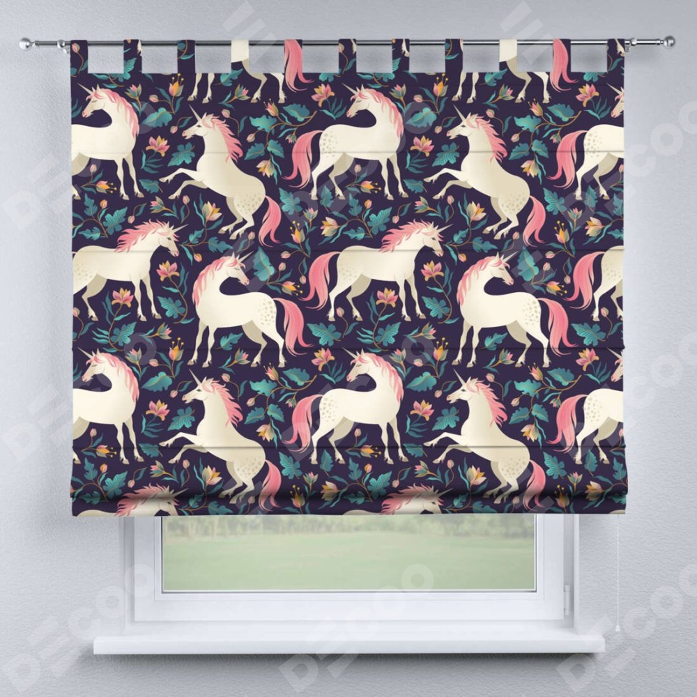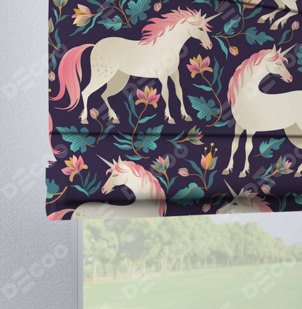 Римская штора производителя «Cortin», используется для проёма, пошита из ткани блэкаут с нанесением сублимационной печати «Сказочные единороги». Данная модель пошита на петлях, комплектуется на выбор круглым карнизом и подходит для монтажа на стену. Римская штора на петлях имеет простую систему регулировки высоты, отличительным преимуществом данной модели является простой способ монтажа. Достаточно повесить ее на трубу и штора готова!