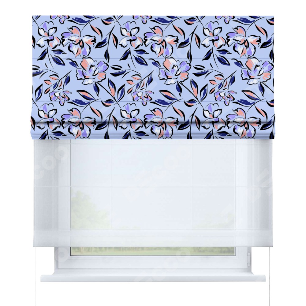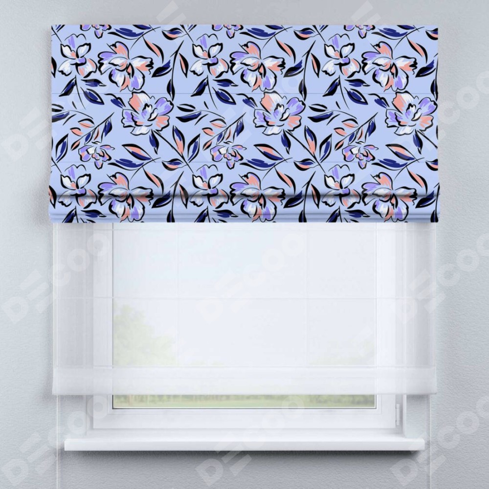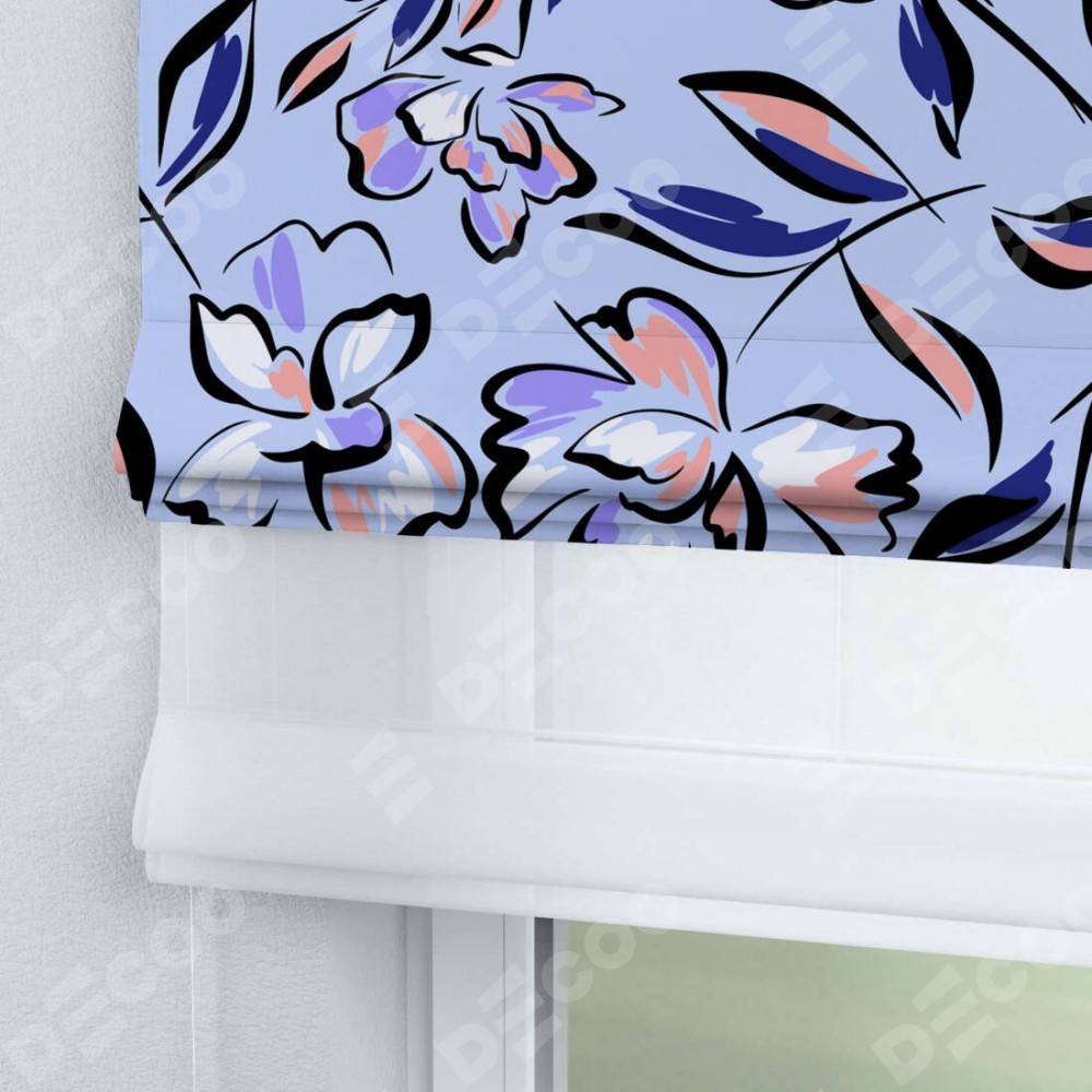 Римская штора день-ночь производителя «Cortin», используется для проёма, пошита из двух полотен, с лицевой блэкаут с нанесением сублимационной печати «Цветочки и листочки», вторая ткань тюль (по стандарту комплектуется тюль белого цвета артикул V-01). Имеет универсальный механизм и подходит для монтажа: на потолок, на стену и в нишу.