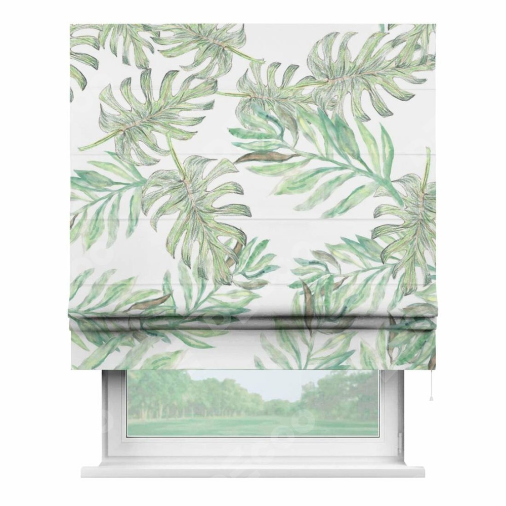 Римская штора производителя «Cortin», используется для проёма, пошита из ткани блэкаут с нанесением сублимационной печати «Листья монстеры». Имеет универсальный механизм и подходит для монтажа: на потолок, на стену и в нишу.